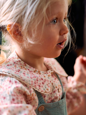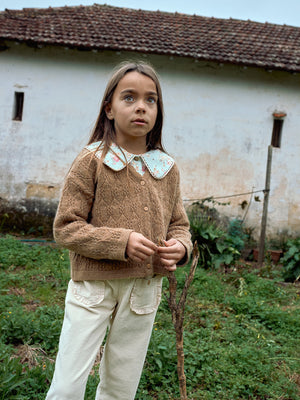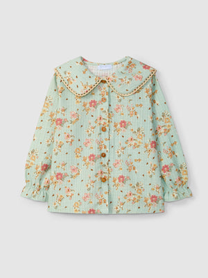 Blouse en tissu texturé 100 % coton avec imprimé à fleurs exclusif « Laranjinha ». Col avec détail de dentelle. Fermeture sur le devant avec des boutons en bois « Laranjinha ».