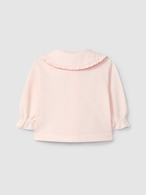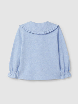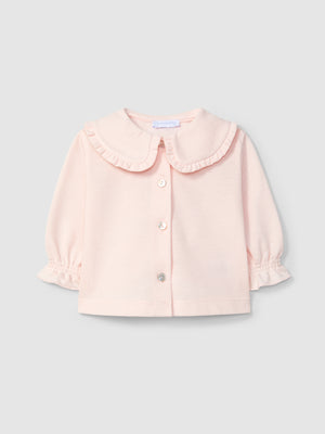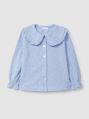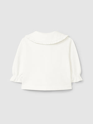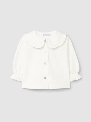 Blouse en piqué 100 % coton cardé et col avec détail de volant. Fermeture avec des boutons en nacre « Laranjinha » sur le devant.