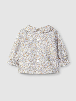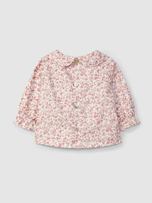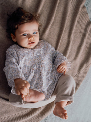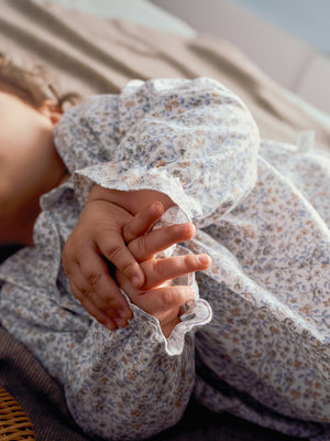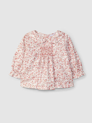 Robe en sergé fin et malléable 100 % coton avec imprimé à fleurs et détail de smocks sur la poitrine. Ouverture avec des boutons en nacre « Laranjinha » dans le dos.