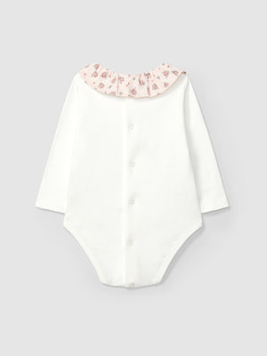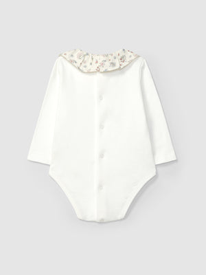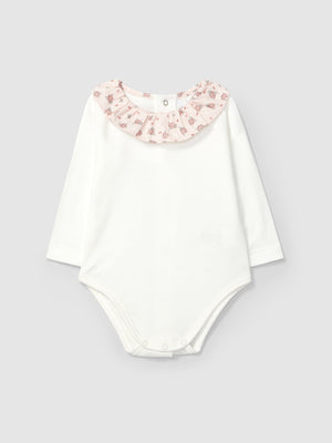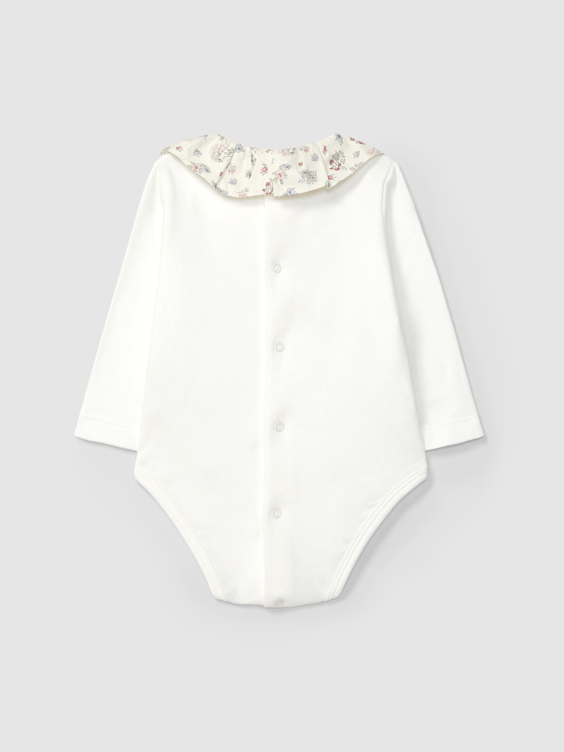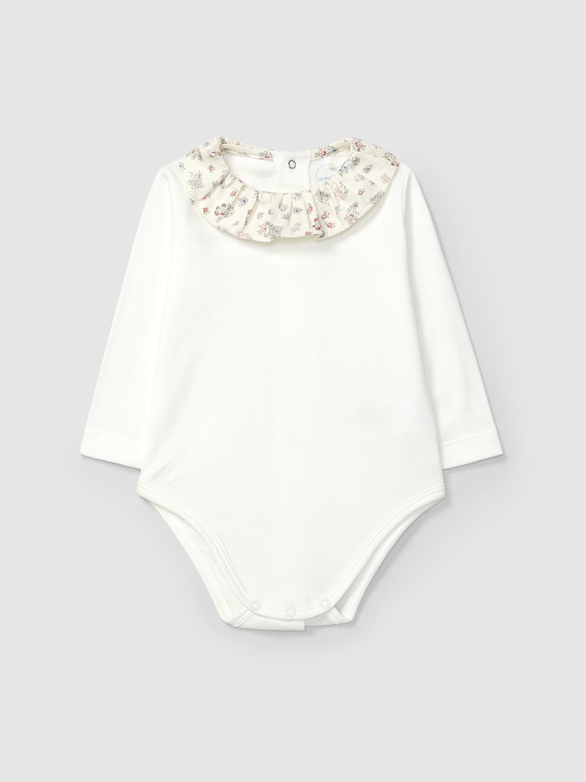 Body en maille 100 % coton cardé. Col à volant en tissu à imprimé à fleurs délicates. Ouverture avec des pressions dans le dos et à l’entrejambe.