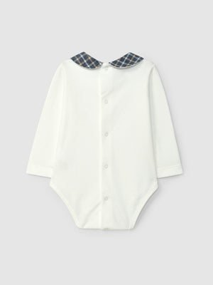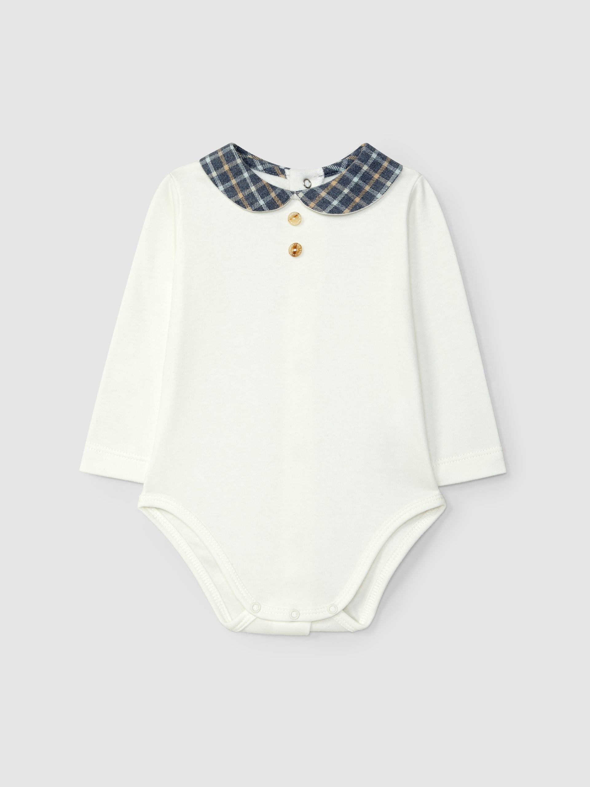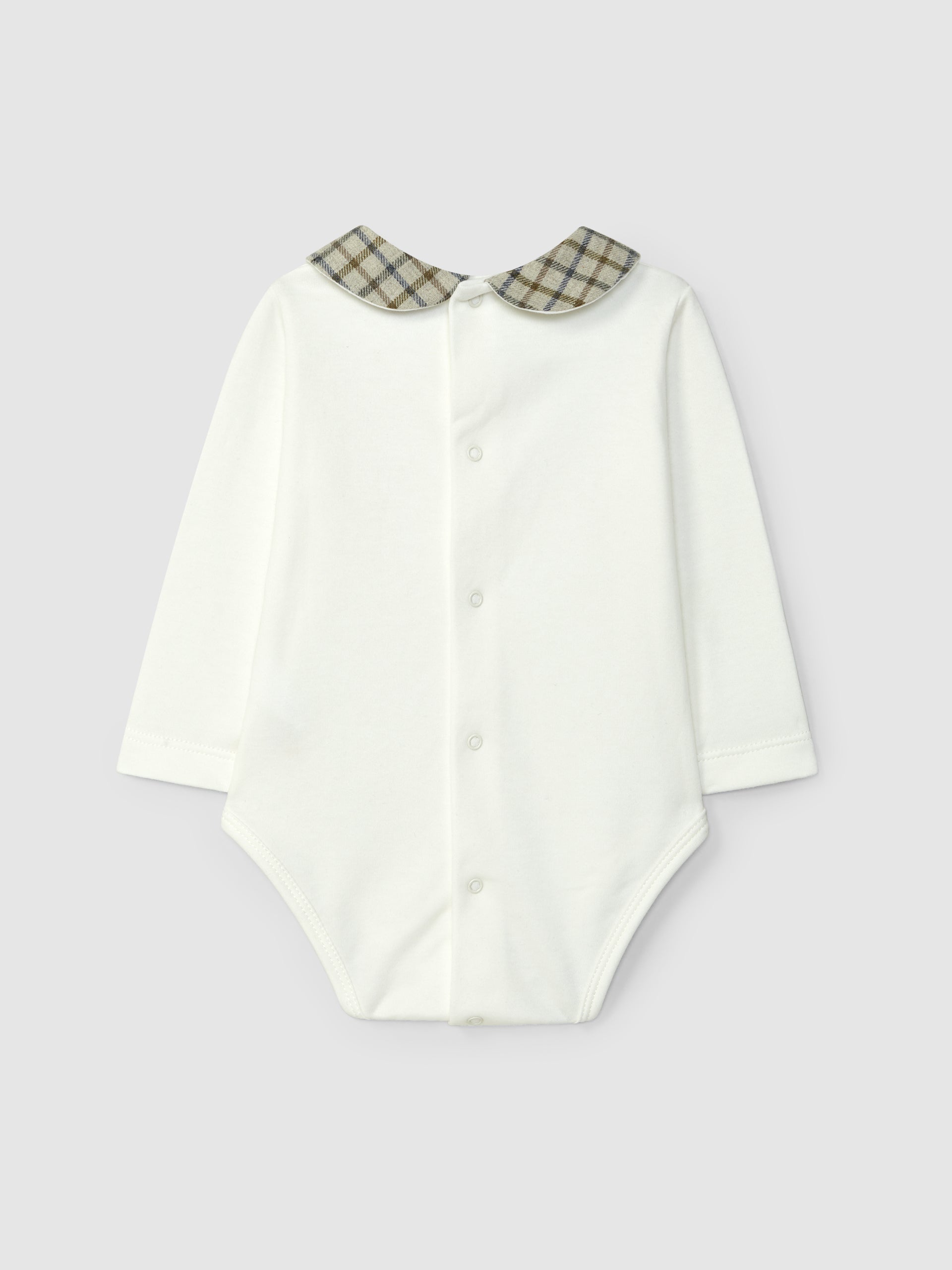 Body en maille 100 % coton cardé à col claudine en tissu à carreaux. Boutons « Laranjinha » décoratifs sur le devant. Ouverture avec des pressions dans le dos et à l’entrejambe.