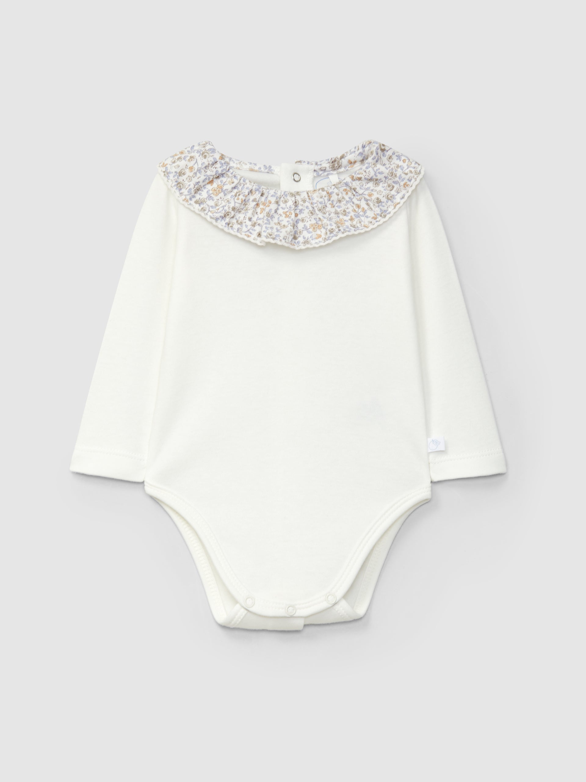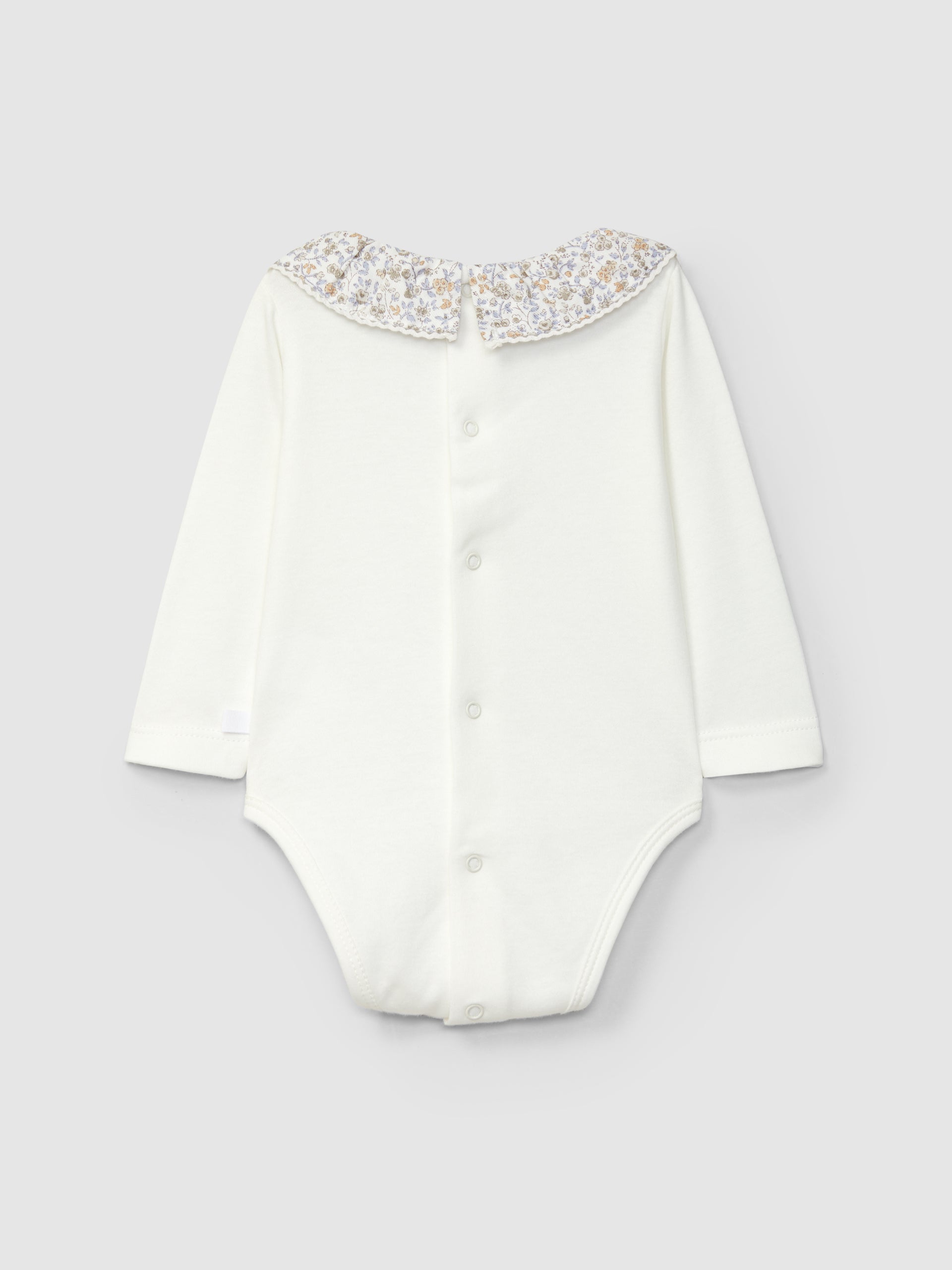 Body en maille 100 % coton cardé. Col à volant en tissu imprimé à fleurs avec détail en dentelle. Ouverture avec des pressions dans le dos et à l’entrejambe.
