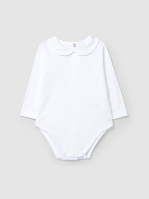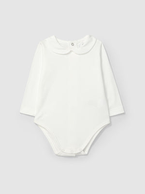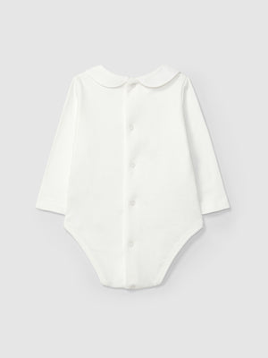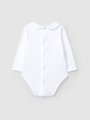 Body en maille 100 % coton cardé à manches longues. Col peter-pan en tissu. Ouverture avec des pressions dans le dos et à l’entrejambe.