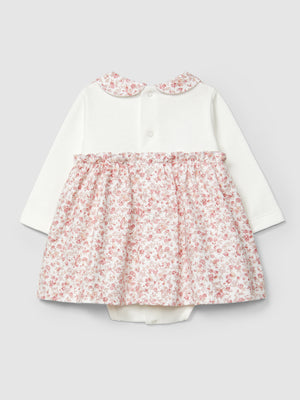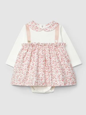 Pièce unique qui donne l'illusion de deux pièces. Body en maille cardée 100 % coton. Col claudine et jupe en sergé fin et malléable avec imprimé à fleurs et bretelles décoratives. Ouverture avec des pressions dans le dos et à l’entrejambe. Pièce spécialement conçue pour faciliter l’habillage du bébé.