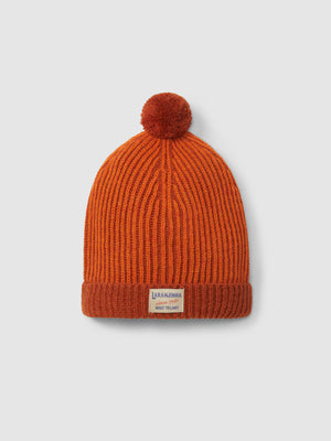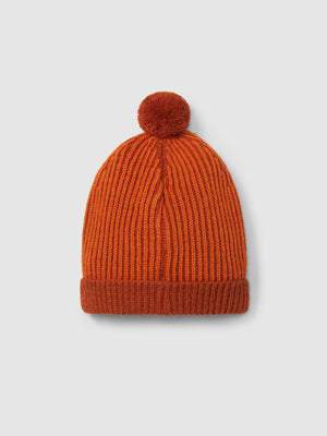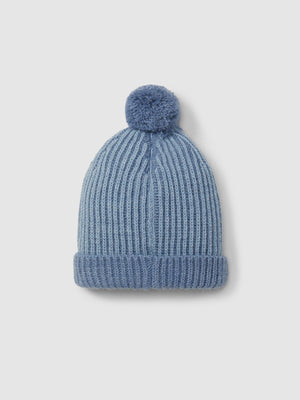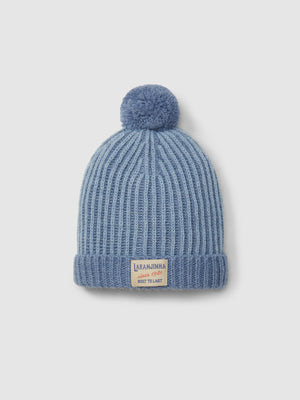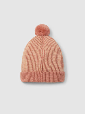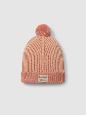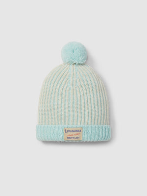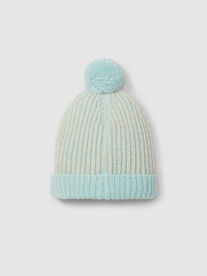 Bonnet tricoté bicolore avec une touche de laine et détail de pompon.