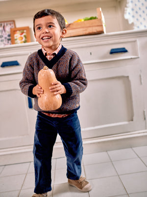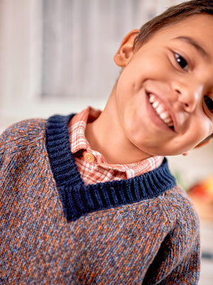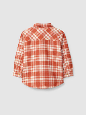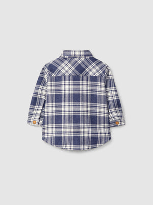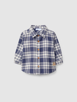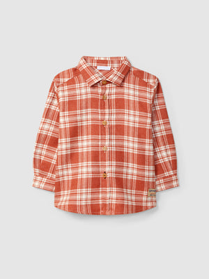 Chemise en flanelle avec imprimé à carreaux. Fermeture avec des boutons en bois « Laranjinha » sur le devant et aux poignets.