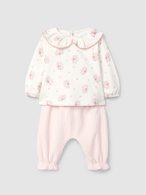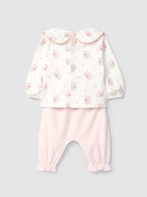Ensemble composé de deux pièces. Pull en maille cardée 100 % coton avec imprimé à fleurs exclusif « Laranjinha ». Col plissé et élastique aux poignets. Fermeture avec des pressions dans le dos. Pantalon en velours cannelé avec détail de volant.