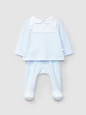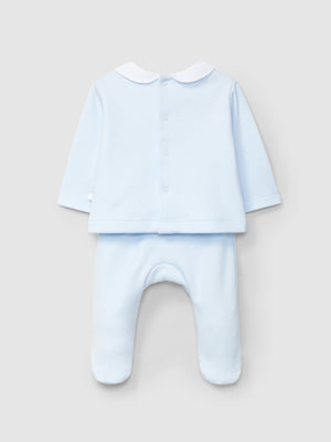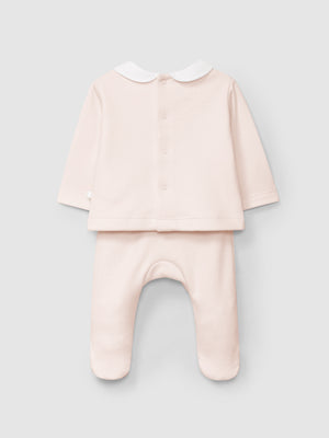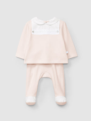Ensemble de deux pièces en maille 100 % coton cardé. Pull avec pièce en tissu à carreaux sur la poitrine et col peter-pan. Détail de ruban brodé et boutons en nacre « Laranjinha » décoratifs sur la poitrine. Fermeture avec des pressions dans le dos. Pantalon avec taille élastique pour un plus grand confort.