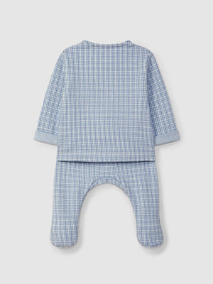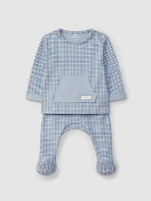 Ensemble deux pièces en maille jacquard à carreaux. Pull avec détail de poche kangourou fonctionnelle sur le devant à l’envers de la maille. Ouverture avec des boutons au col. Pantalon avec taille élastique pour un plus grand confort.