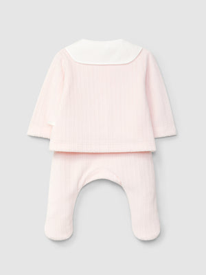 Ensemble deux pièces en maille de velours cannelé. Pull col claudine en tissu avec détails de fleurs délicates brodées. Ouverture avec des pressions sur le devant. Pantalon avec taille élastique pour un plus grand confort.