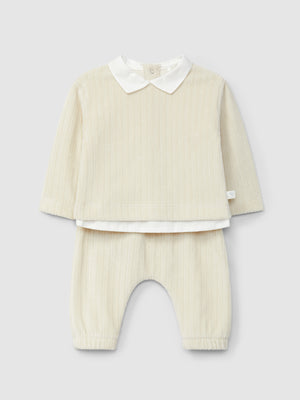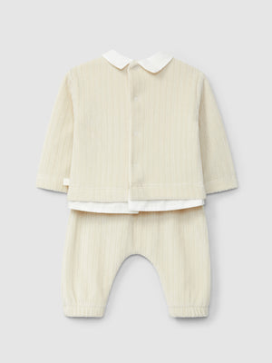 Ensemble deux pièces en maille de velours cannelé. Col en V en tissu et détail sur le pull. Fermeture avec des pressions dans le dos. Pantalon avec taille élastique pour un plus grand confort.