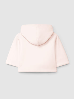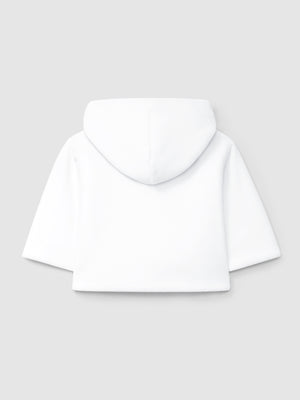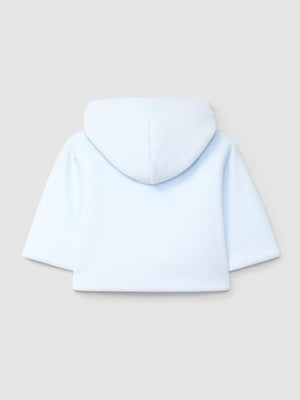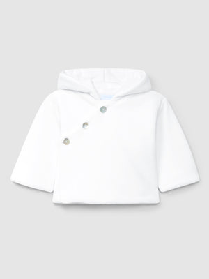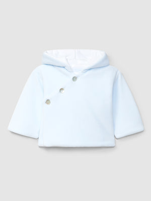 Gilet à capuche uni en velours doublé en maille de coton. Fermeture croisée avec une pression à l’intérieur et des boutons en nacre « Laranjinha » à l’extérieur.