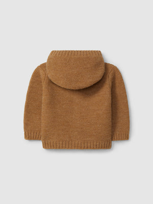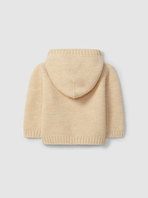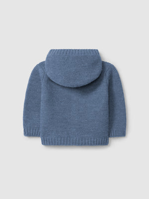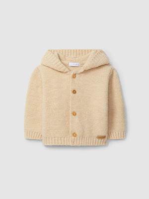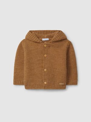 Gilet à capuche tricoté en point de chaînette. Fermeture sur le devant avec des boutons en bois « Laranjinha ».
