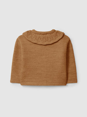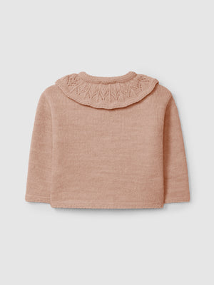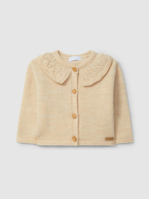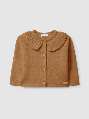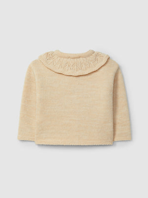 Gilet tricoté en point droit à col à volant travaillé. Fermeture sur le devant avec des boutons en bois « Laranjinha ».