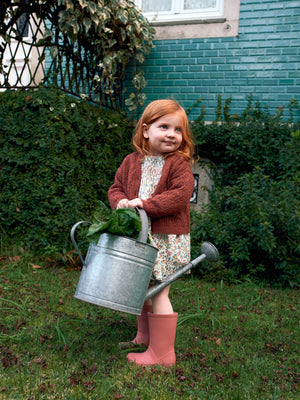 Robe en tissu avec imprimé de fleurs délicates et détail de smocks sur la poitrine. Ouverture avec des boutons « Laranjinha » dans le dos.
