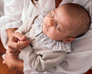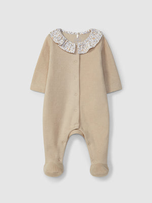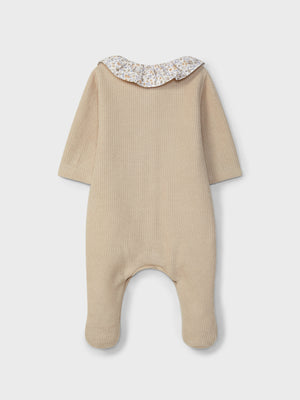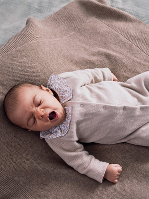 Babygrow en maille 100 % coton biologique aspect tricoté au toucher doux et chaud. Col à volant en tissu fin et malléable. Fermeture avec des pressions sur le devant et à l’entrejambe.