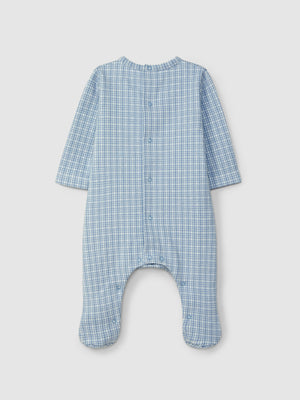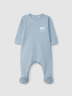 Babygrow en maille jacquard à carreaux. Détail de poche fonctionnelle sur le devant à l’envers de la maille. Ouverture avec des pressions dans le dos sur toute la longueur et à l’entrejambe.