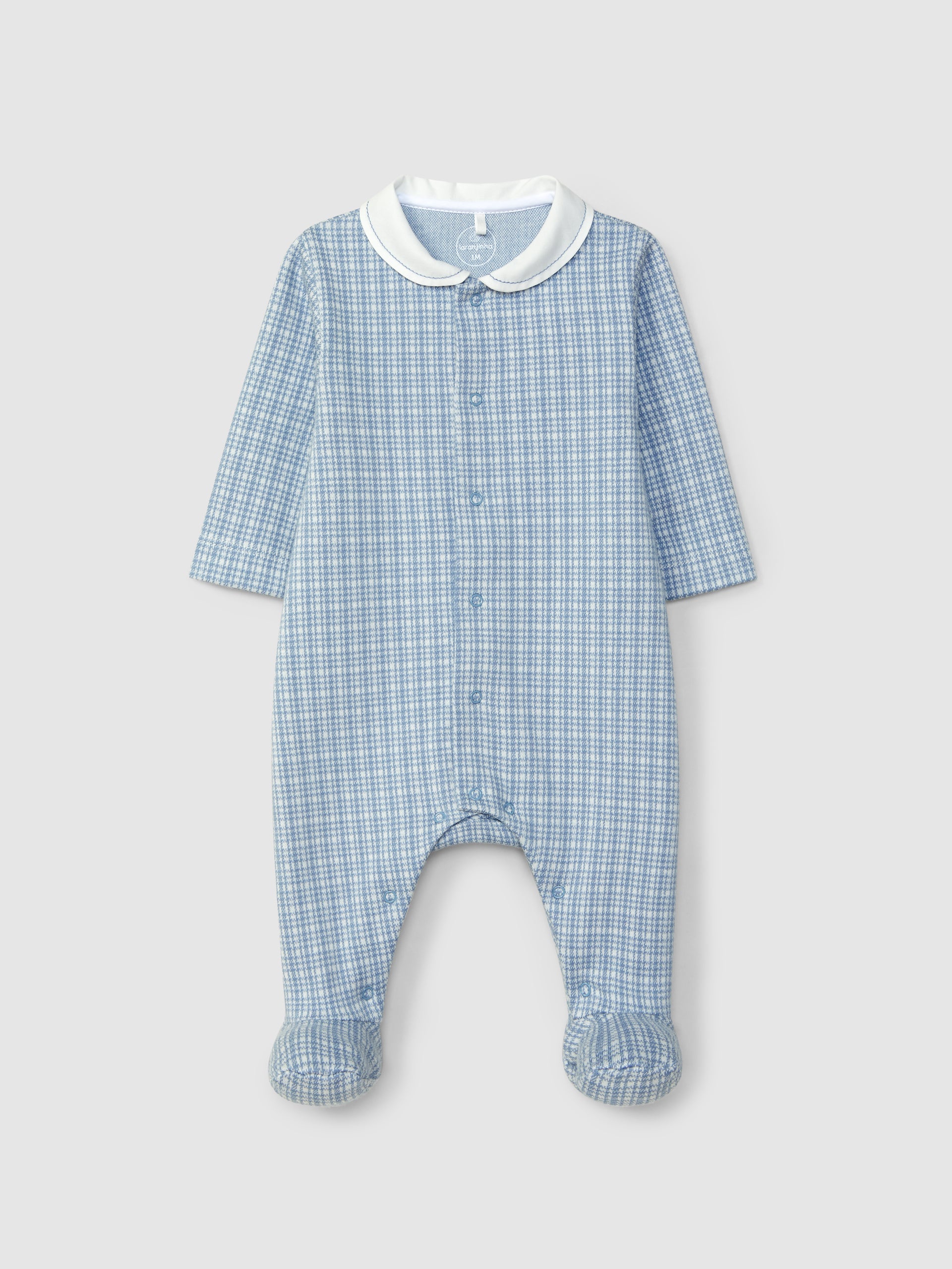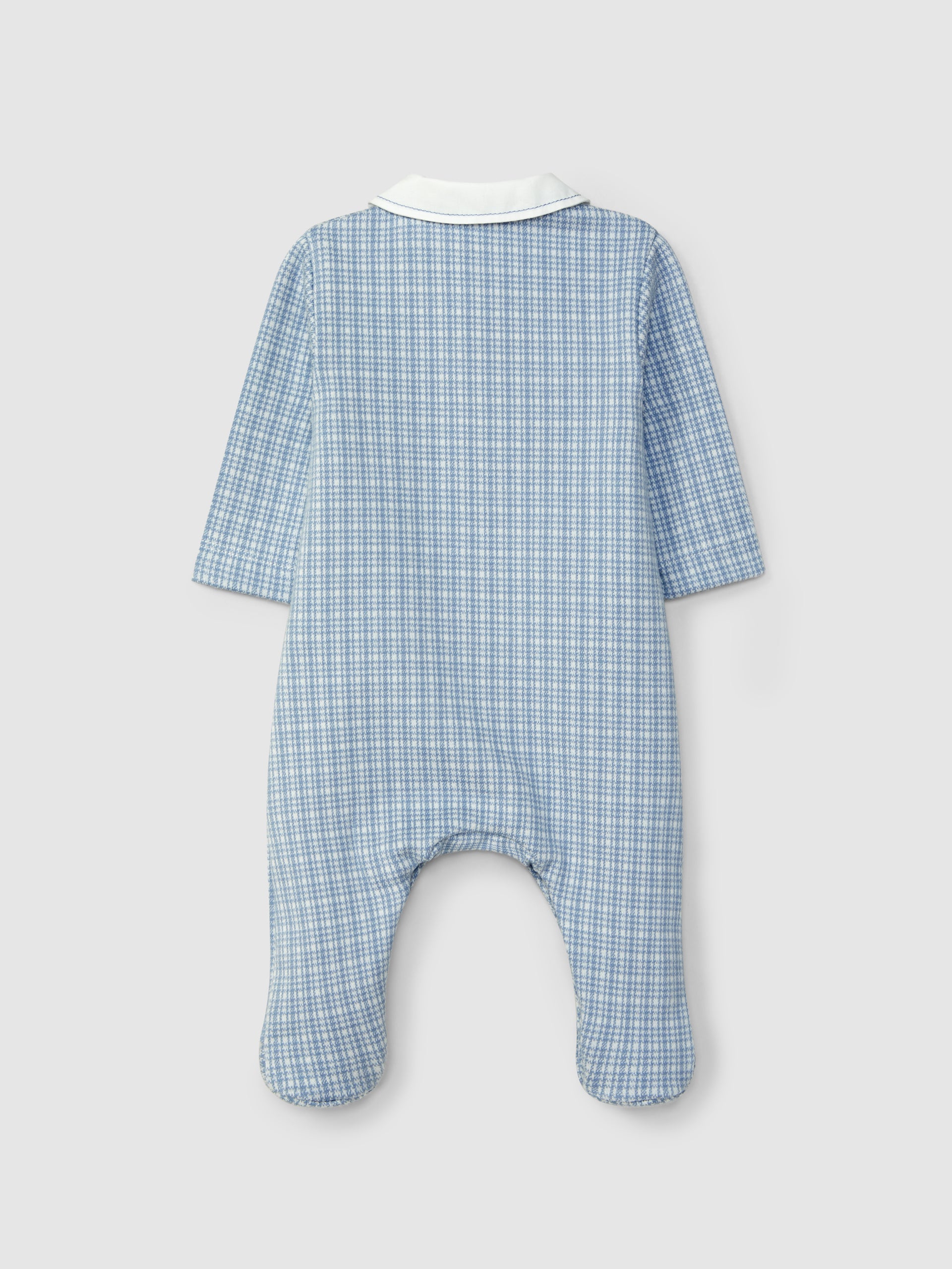 Babygrow en maille jacquard à carreaux. Col claudine avec détail surpiqué de la même couleur que celle de la maille. Ouverture avec des pressions sur le devant sur toute la longueur et à l’entrejambe.