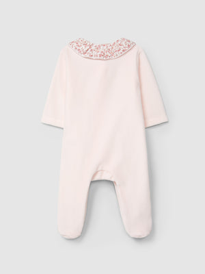 Babygrow en velours. Col à volant en sergé fin et malléable avec imprimé à fleurs et détail en dentelle. Fermeture avec des pressions cachées sur le devant et à l’entrejambe.