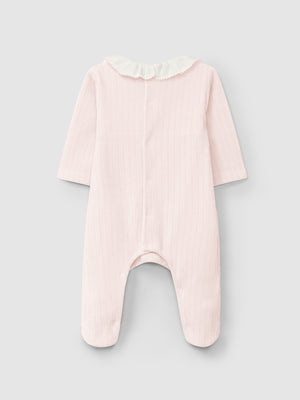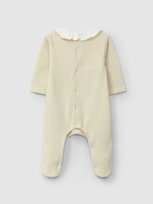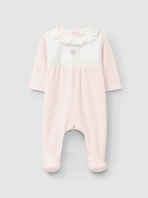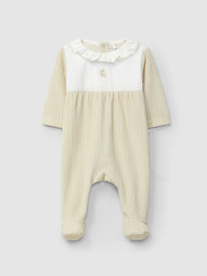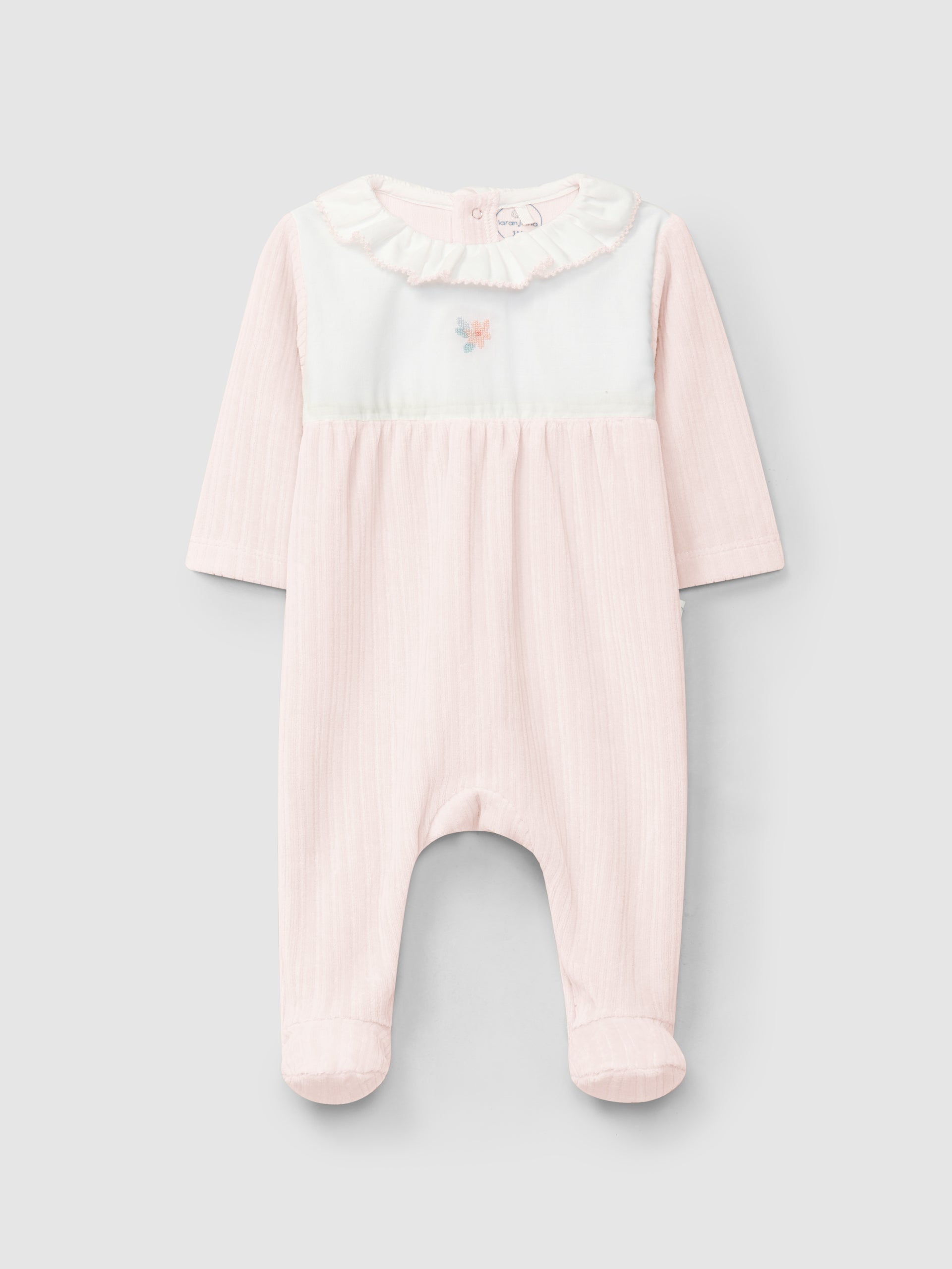 Babygrow en maille de velours cannelé à col à volant et pièce en tissu sur la poitrine. Détail en broderie. Ouverture avec des pressions dans le dos et à l’entrejambe.