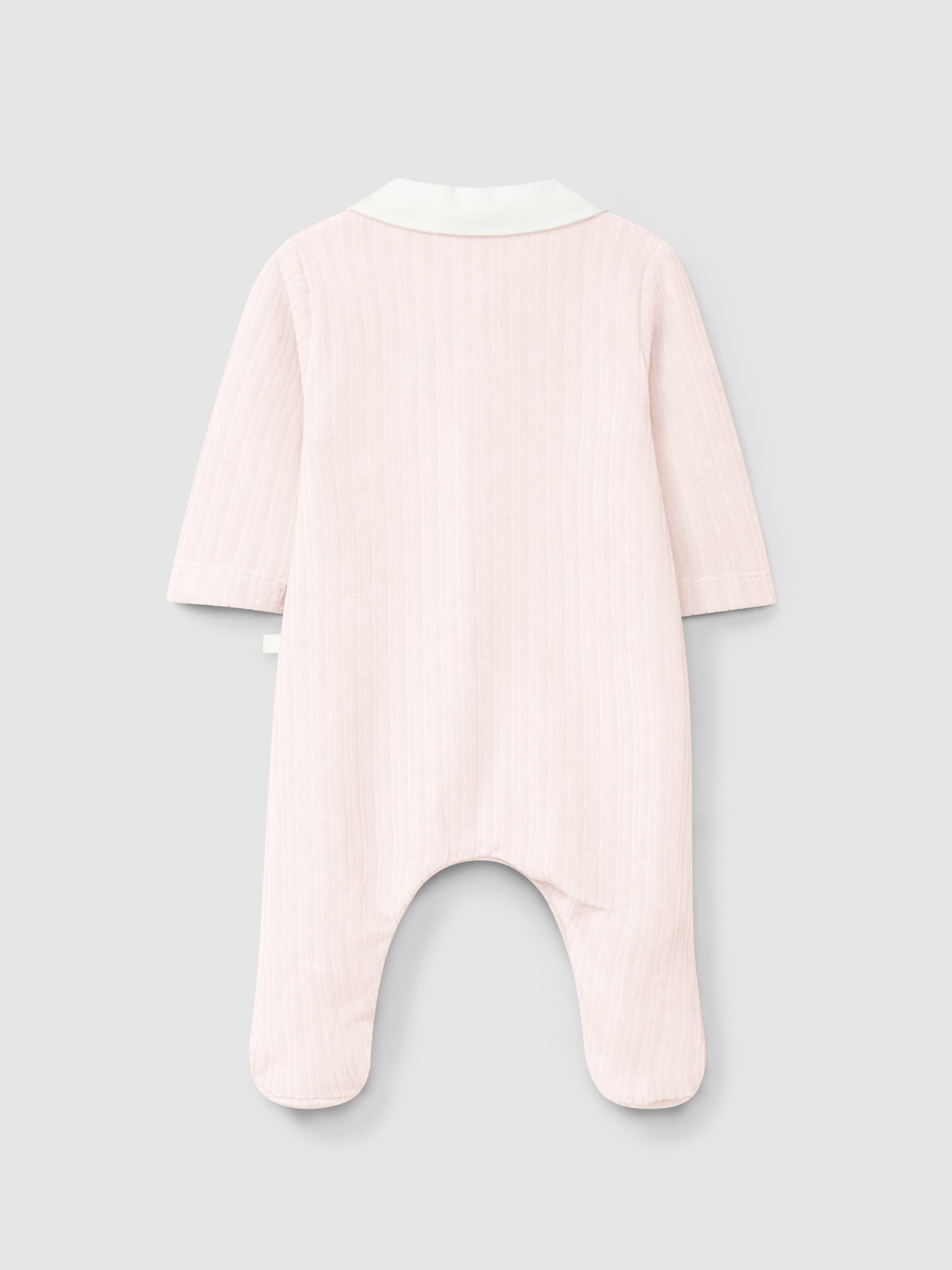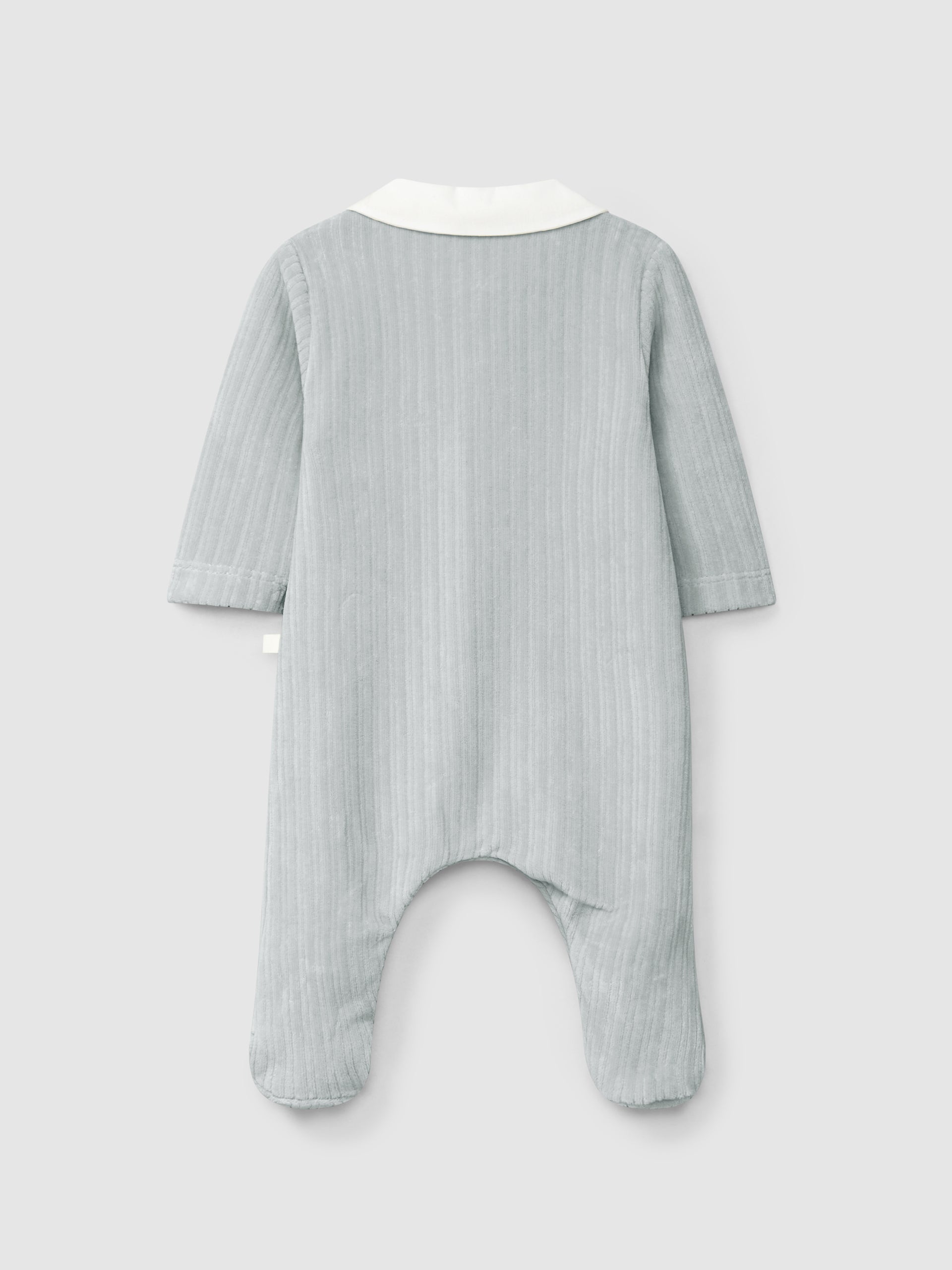 Babygrow en maille de velours cannelé à col claudine en tissu. Boutons décoratifs sur le devant. Fermeture avec des pressions cachées sur le devant et à l’entrejambe de l’un des côtés.
