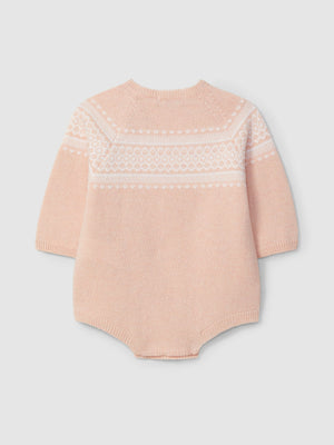 Barboteuse tricotée avec une touche de cachemire et détail de jacquard. Ouverture avec des boutons en nacre « Laranjinha » sur le devant et à l’entrejambe.