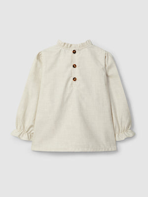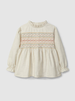 Blouse en tissu mélangé 100 % coton avec smocks sur la poitrine et détails de volant au col et aux poignets. Ouverture avec des boutons dans le dos.