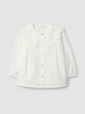 Blouse en tissu texturé 100 % coton à col délicat en broderie anglaise. Fermeture avec des boutons en nacre « Laranjinha » sur le devant.