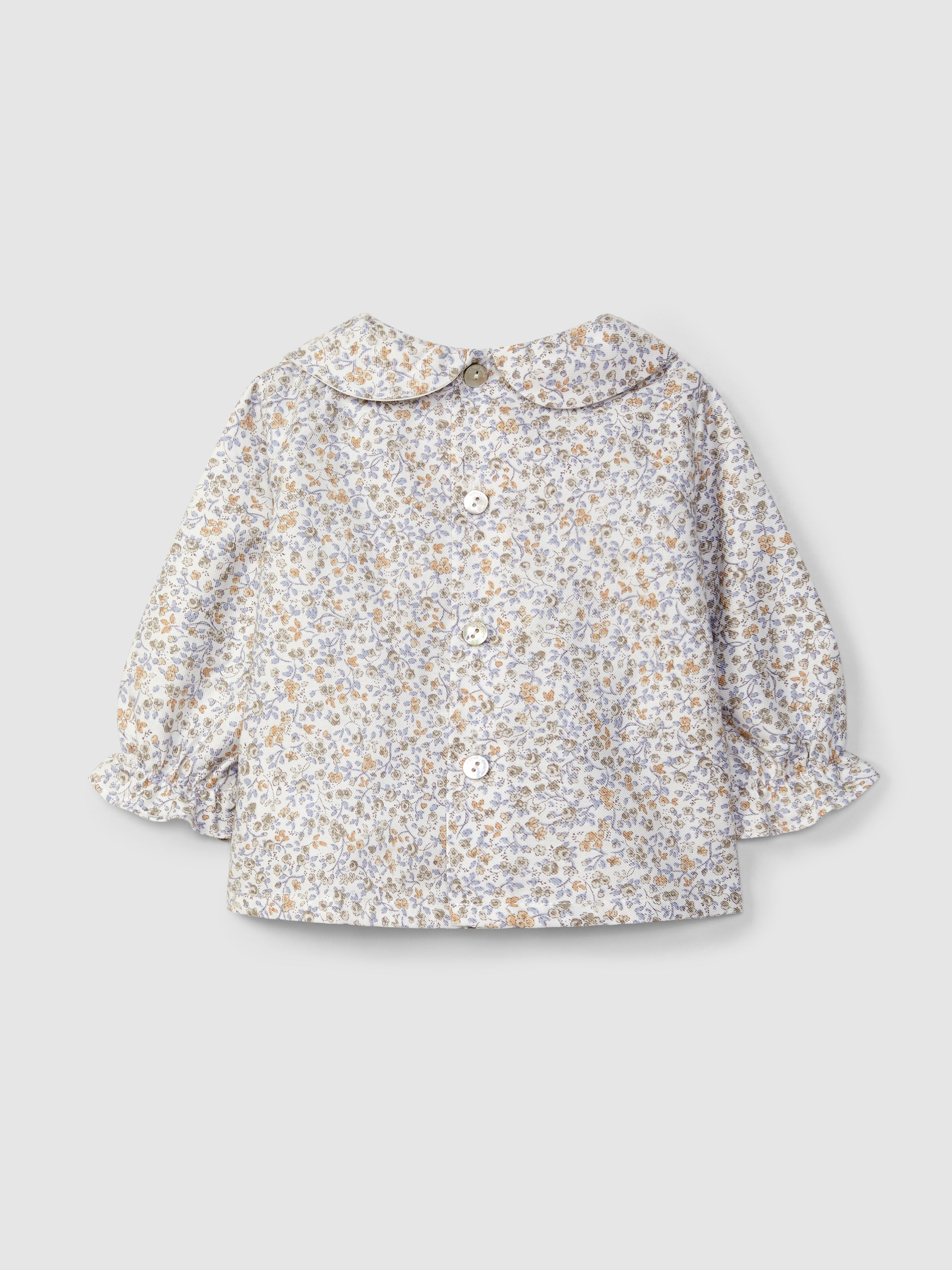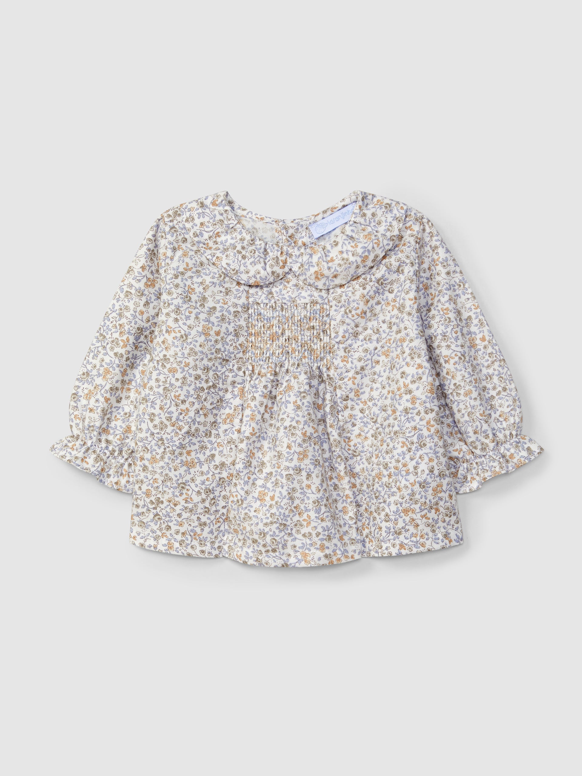 Robe en sergé fin et malléable 100 % coton avec imprimé à fleurs et détail de smocks sur la poitrine. Ouverture avec des boutons en nacre « Laranjinha » dans le dos.