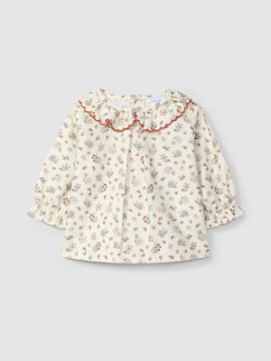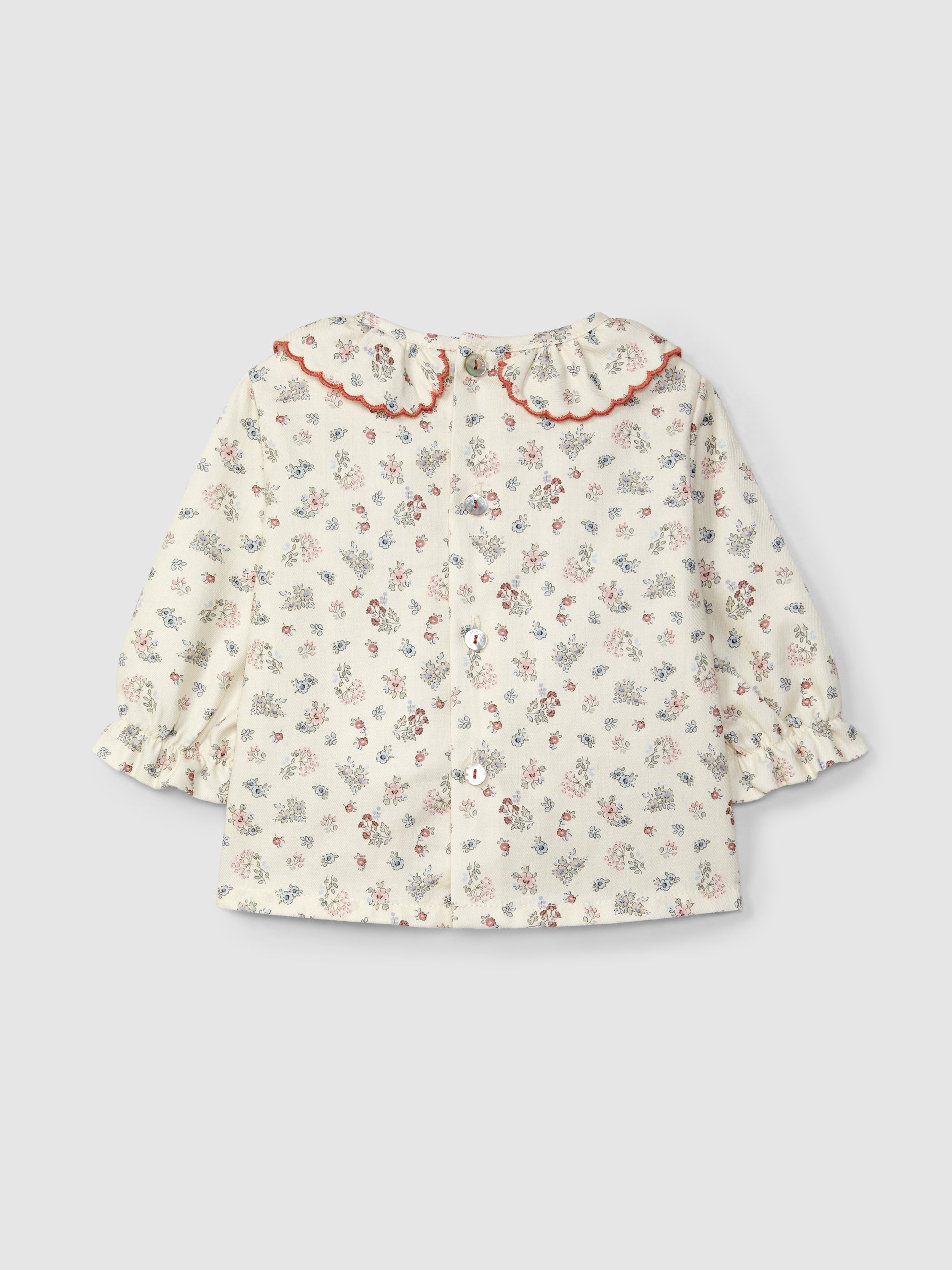 Blouse en tissu 100 % coton avec imprimé fleuri délicat. Col peter-pan avec plissures et détail arrondi avec broderie de couleur en contraste. Ouverture avec des boutons en nacre « Laranjinha » dans le dos.