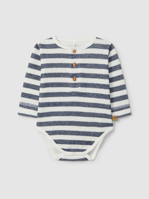 Body à col mao en maille à rayures avec aspect tricoté 100 % coton. Ouverture avec des boutons en bois « Laranjinha » sur le devant et avec des pressions à l’entrejambe.