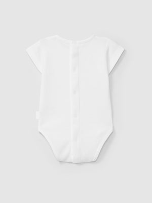 Body à col rond en maille gaufrée 100 % coton. Détail de patte de boutonnage avec bouton en bois « Laranjinha » décoratif. Fermeture avec des pressions dans le dos (jusqu’à la taille 3 mois sur toute la longueur, jusqu’à la moitié à partir de la taille 6 mois) et à l'entrejambe.
