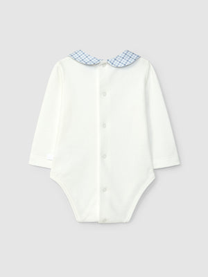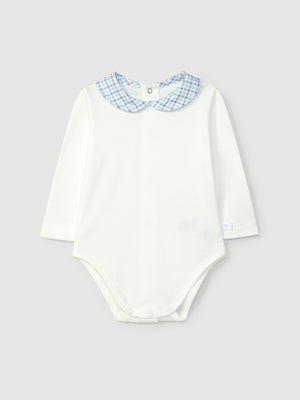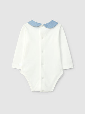 Body en maille 100% coton cardé à manches longues et col claudine en tissu. Ouverture avec des pressions dans le dos et à l’entrejambe.