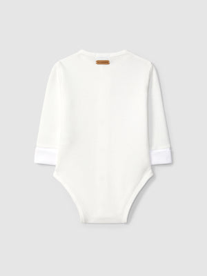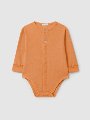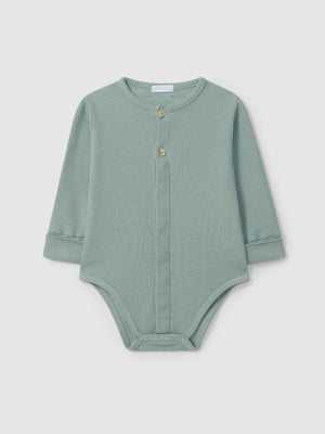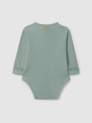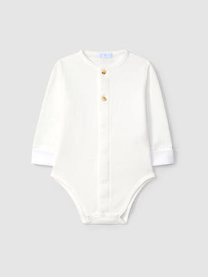 Body à col rond en maille gaufrée 100 % coton. Les poignets en maille cannelée peuvent être portés pliés ou dépliés pour une plus grande durabilité. Ouverture avec des boutons « Laranjinha » et avec des pressions cachées sur le devant et à l’entrejambe.