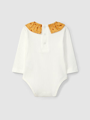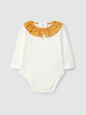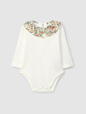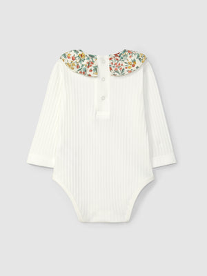Body en maille de coton cannelée à col à volant en tissu imprimé à fleurs. Détail de boutons « Laranjinha » décoratifs sur la poitrine. Ouverture avec des pressions dans le dos et à l’entrejambe.