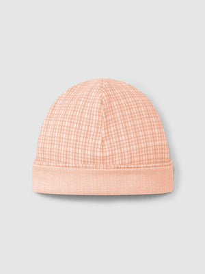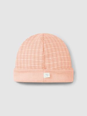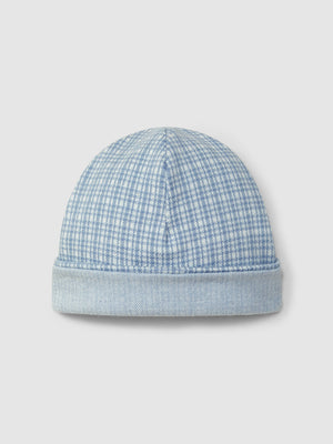 Bonnet en maille jacquard à carreaux. Pli pour une meilleure adaptation à la tête du bébé.