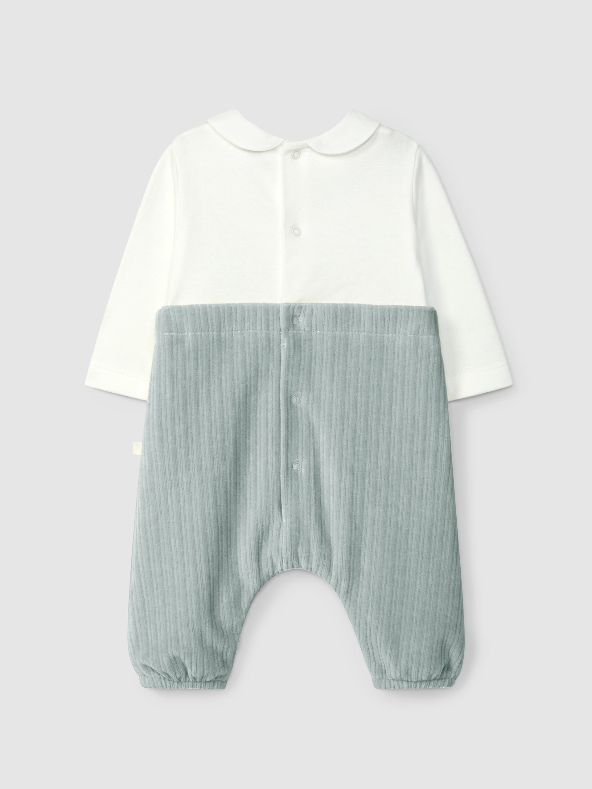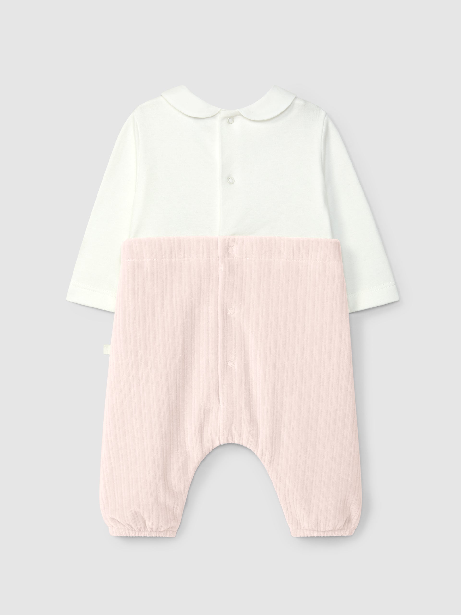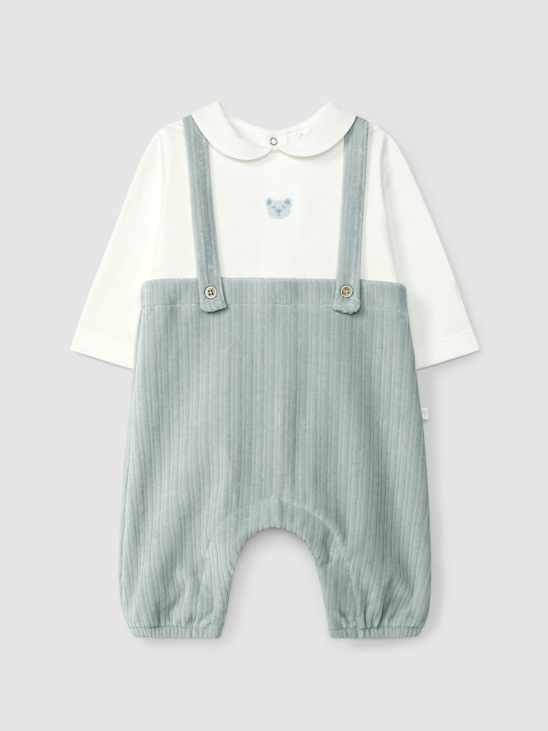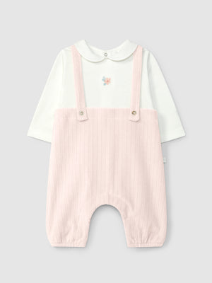 Pièce unique qui donne l'illusion de deux pièces. Partie supérieure en maille de coton cardé avec détail en broderie et col claudine. Salopette en maille de velours cannelé avec boutons décoratifs sur le devant. Ouverture avec des pressions dans le dos et à l’entrejambe. Pièce conçue pour faciliter l’habillage du bébé.
