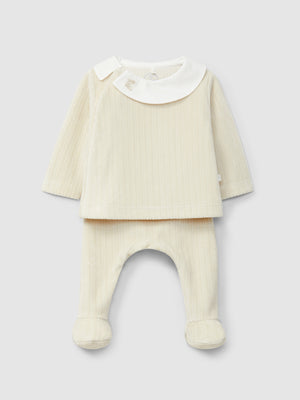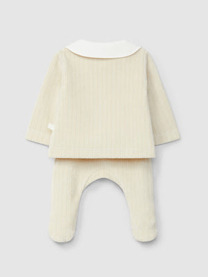 Ensemble deux pièces en maille de velours cannelé. Pull col claudine en tissu avec détail en broderie. Ouverture à l'avant avec pressions cachées. Pantalon avec taille élastique pour un plus grand confort.
