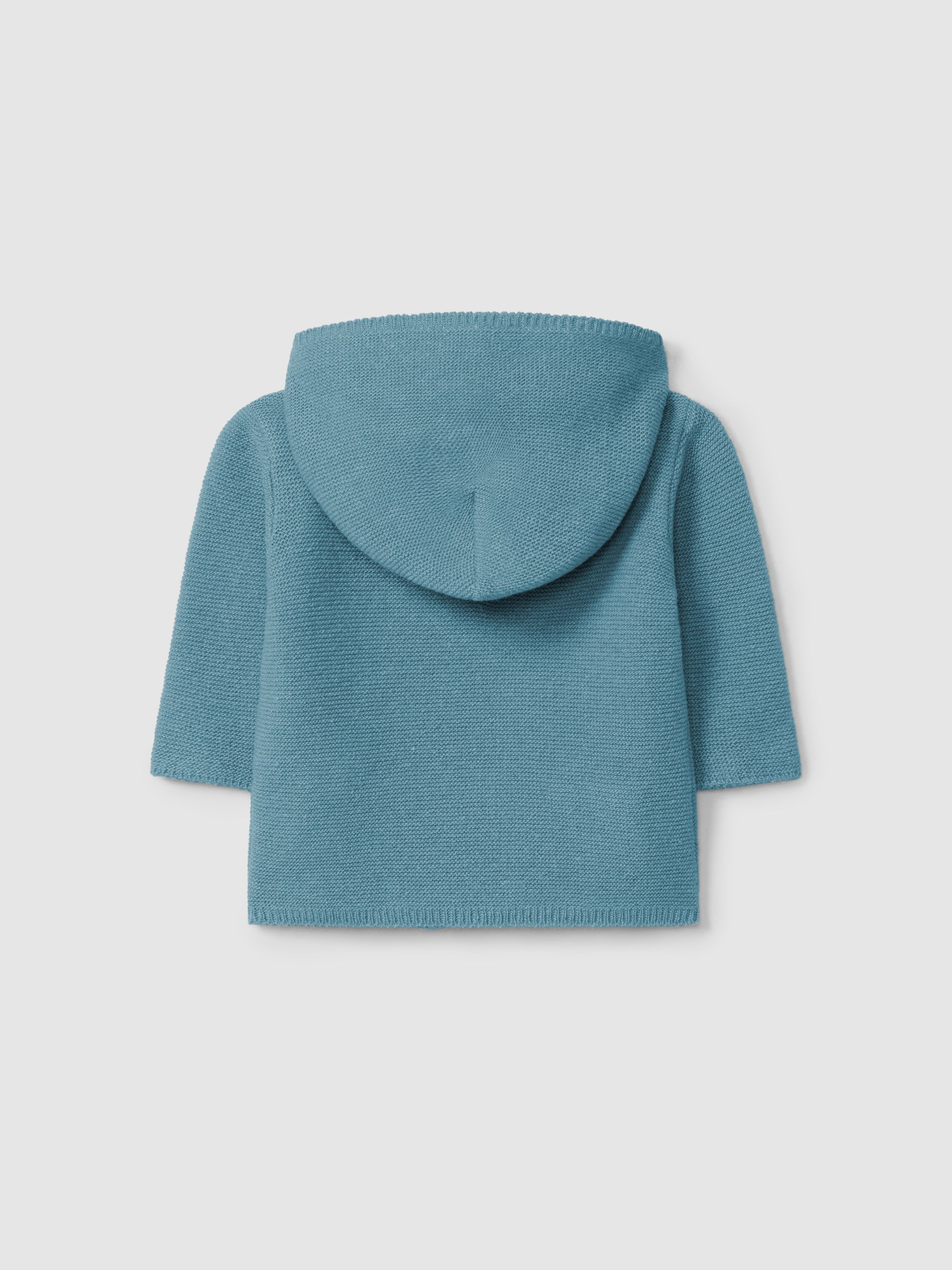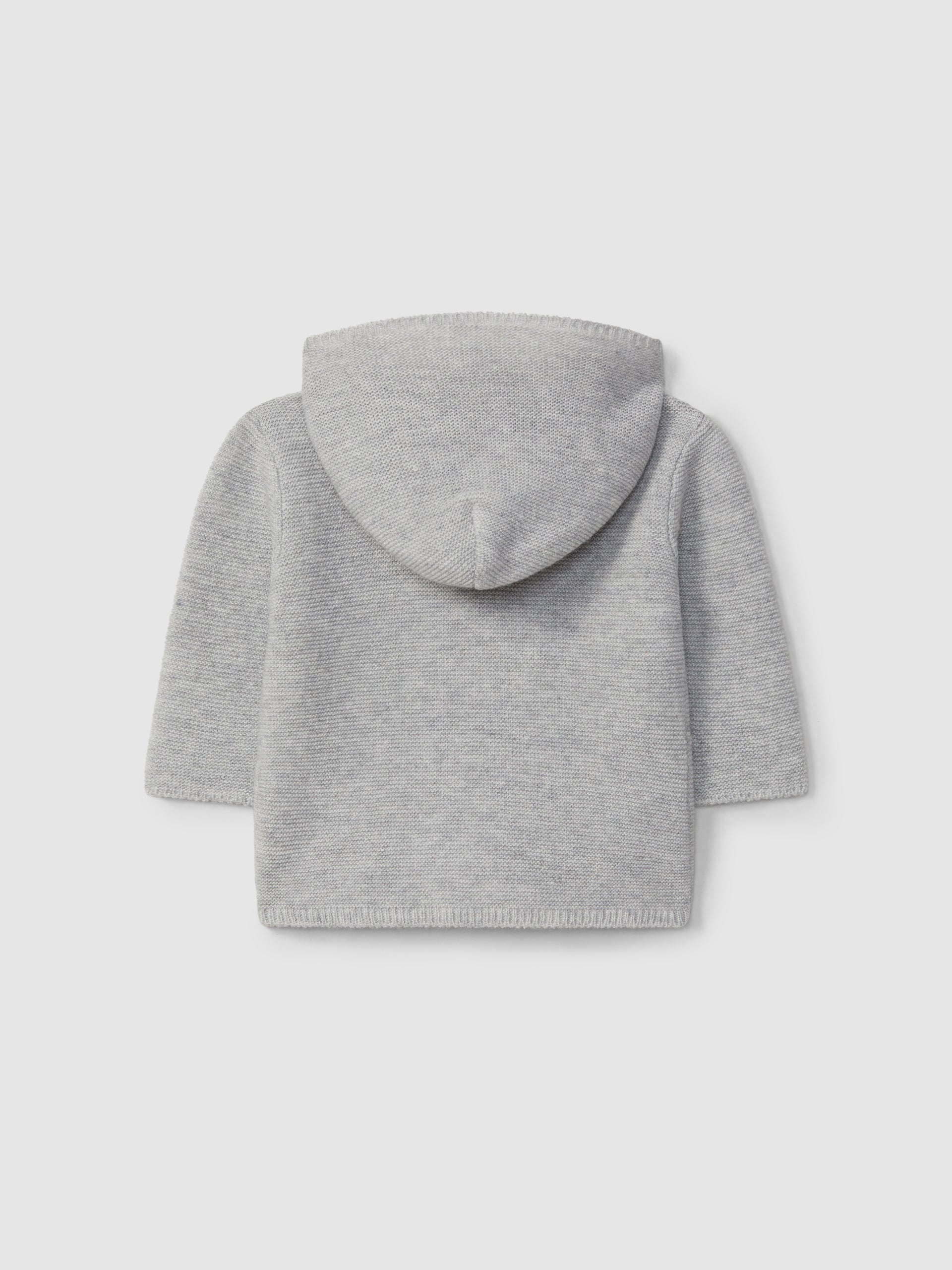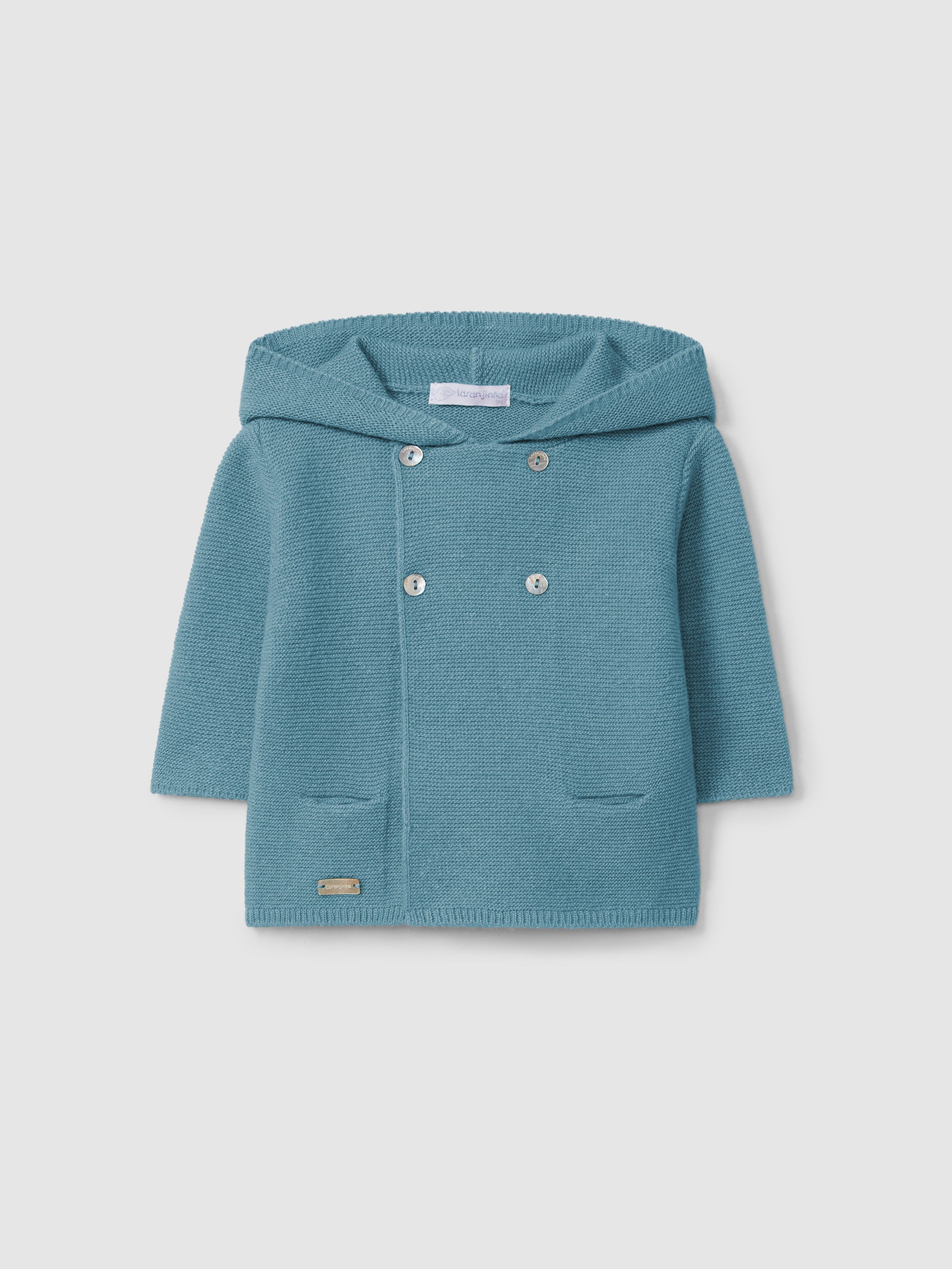 Gilet à capuche tricoté avec une touche de cachemire en point de chaînette. Poches fonctionnelles sur le devant. Fermeture croisée avec des boutons en nacre « Laranjinha »