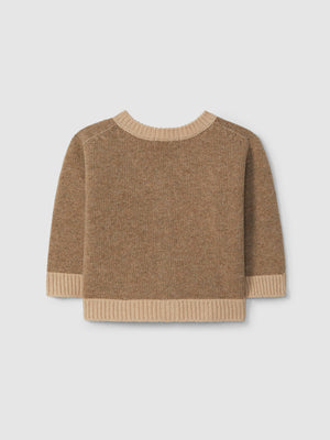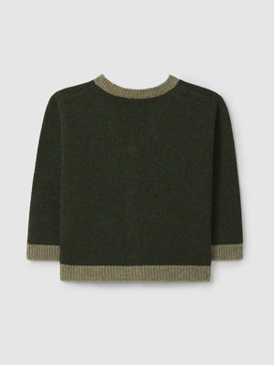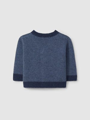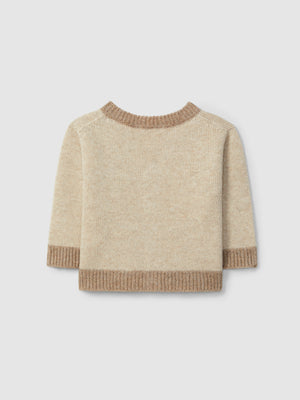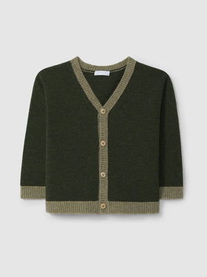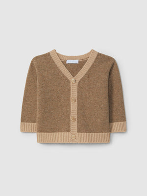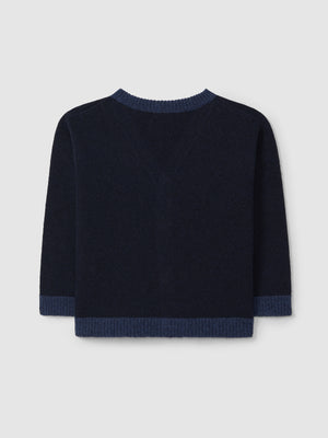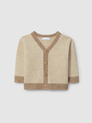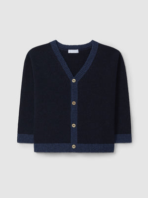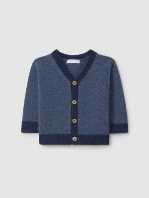 Gilet col en V tricoté en point droit avec une touche de cachemire. Détail de couleur en contraste. Fermeture avec des boutons « Laranjinha » sur le devant sur toute la longueur.