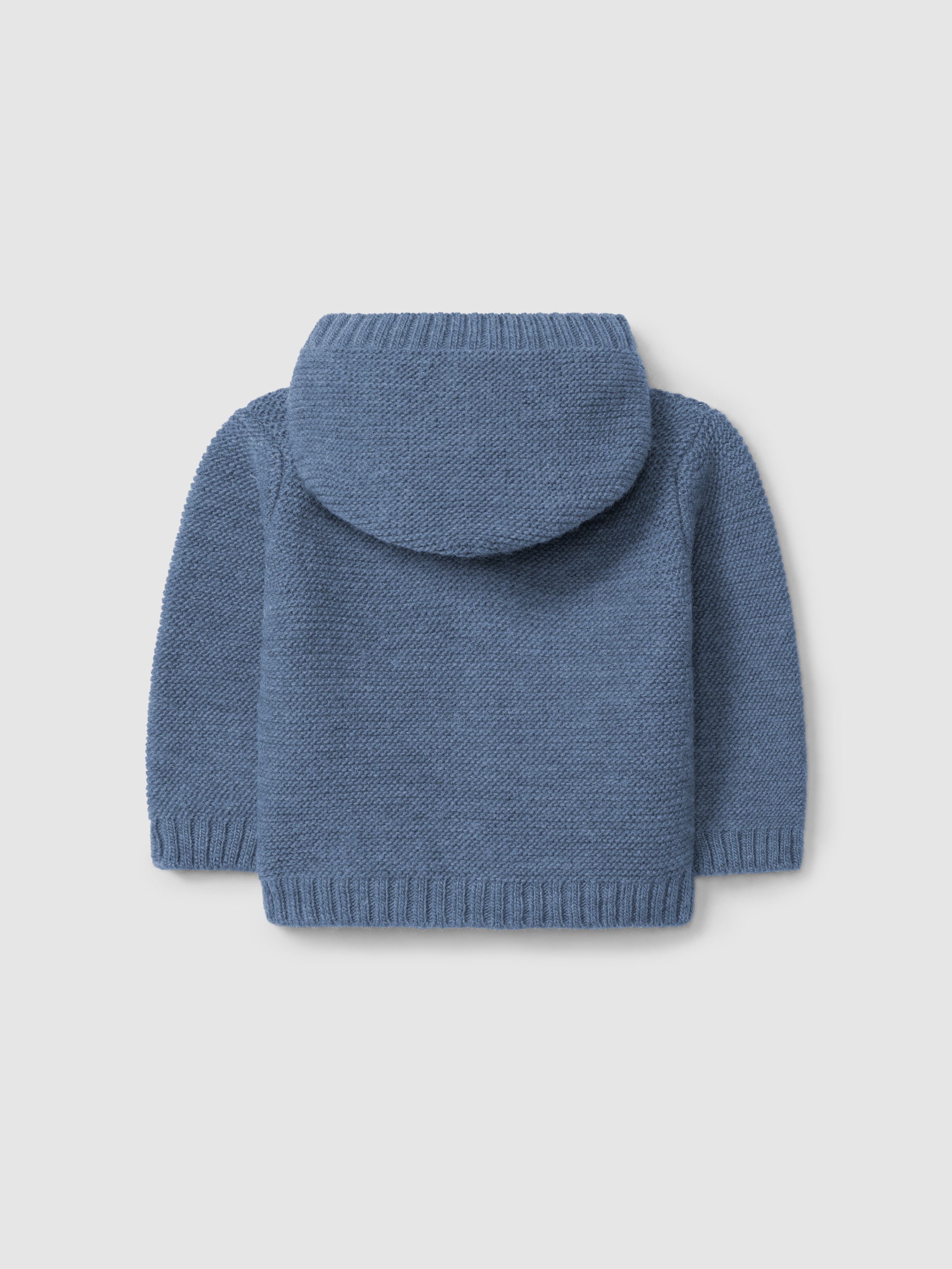 Gilet à capuche tricoté en point de chaînette. Fermeture sur le devant avec des boutons en bois « Laranjinha ».