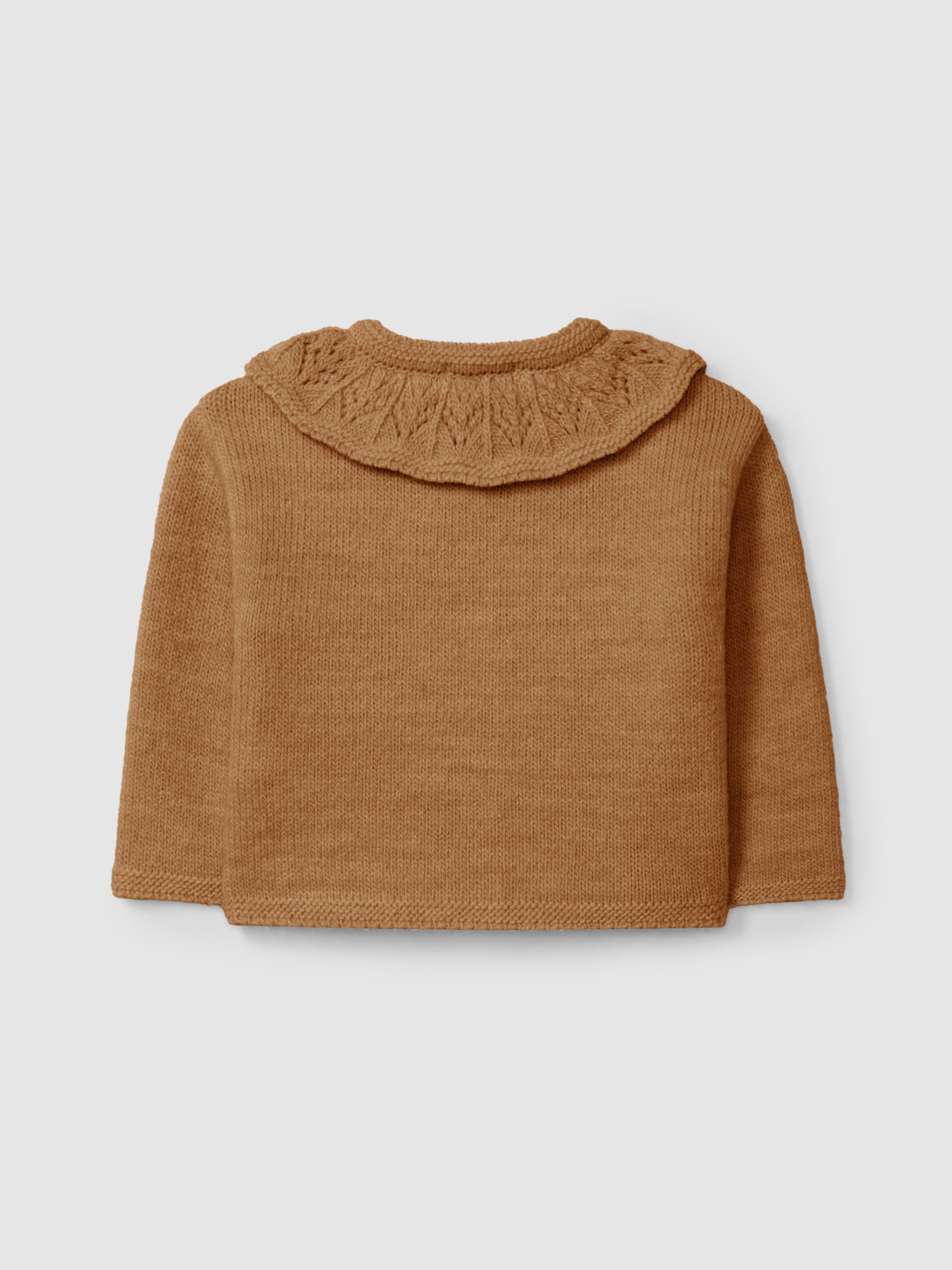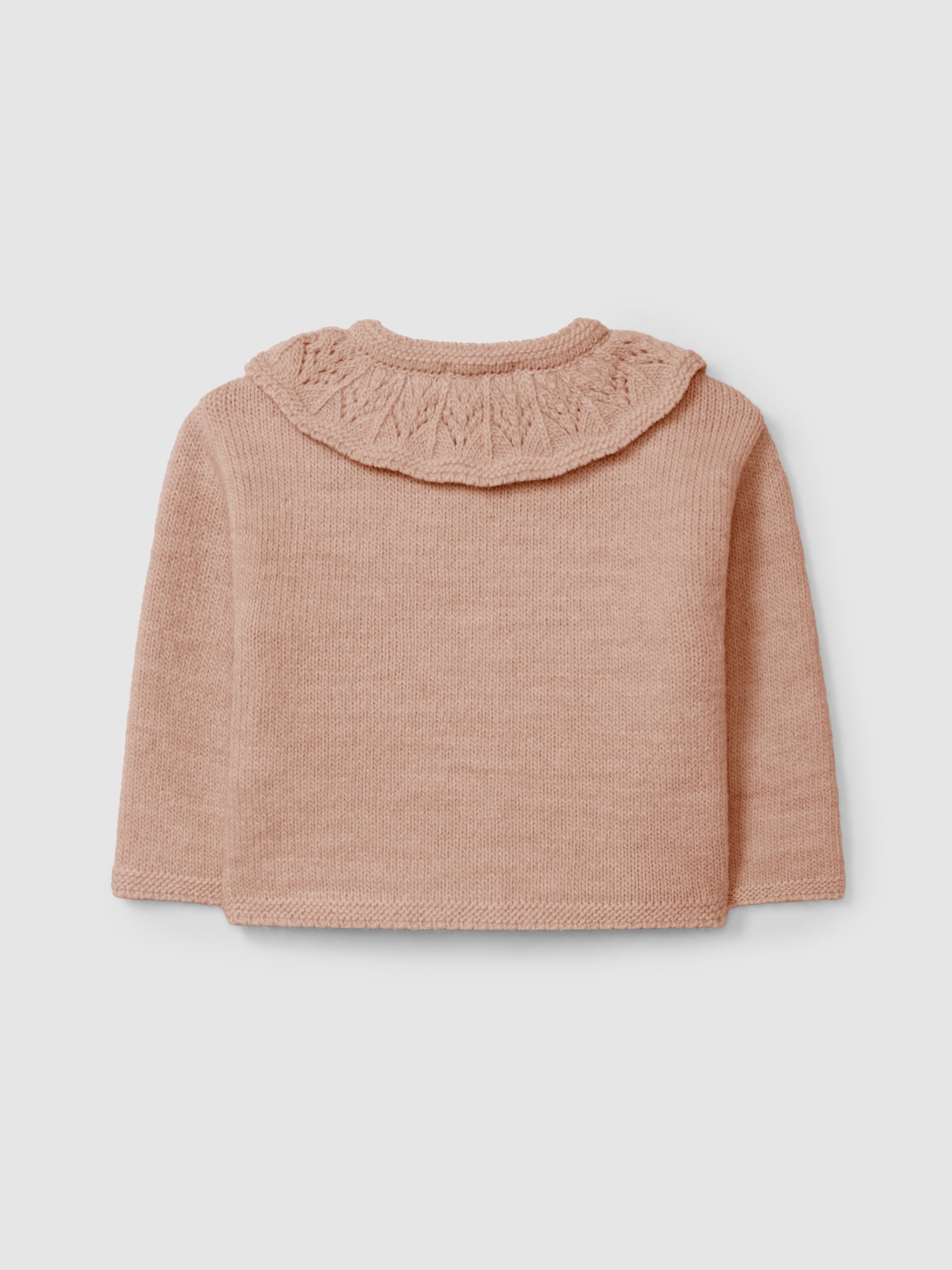 Gilet tricoté en point droit à col à volant travaillé. Fermeture sur le devant avec des boutons en bois « Laranjinha ».
