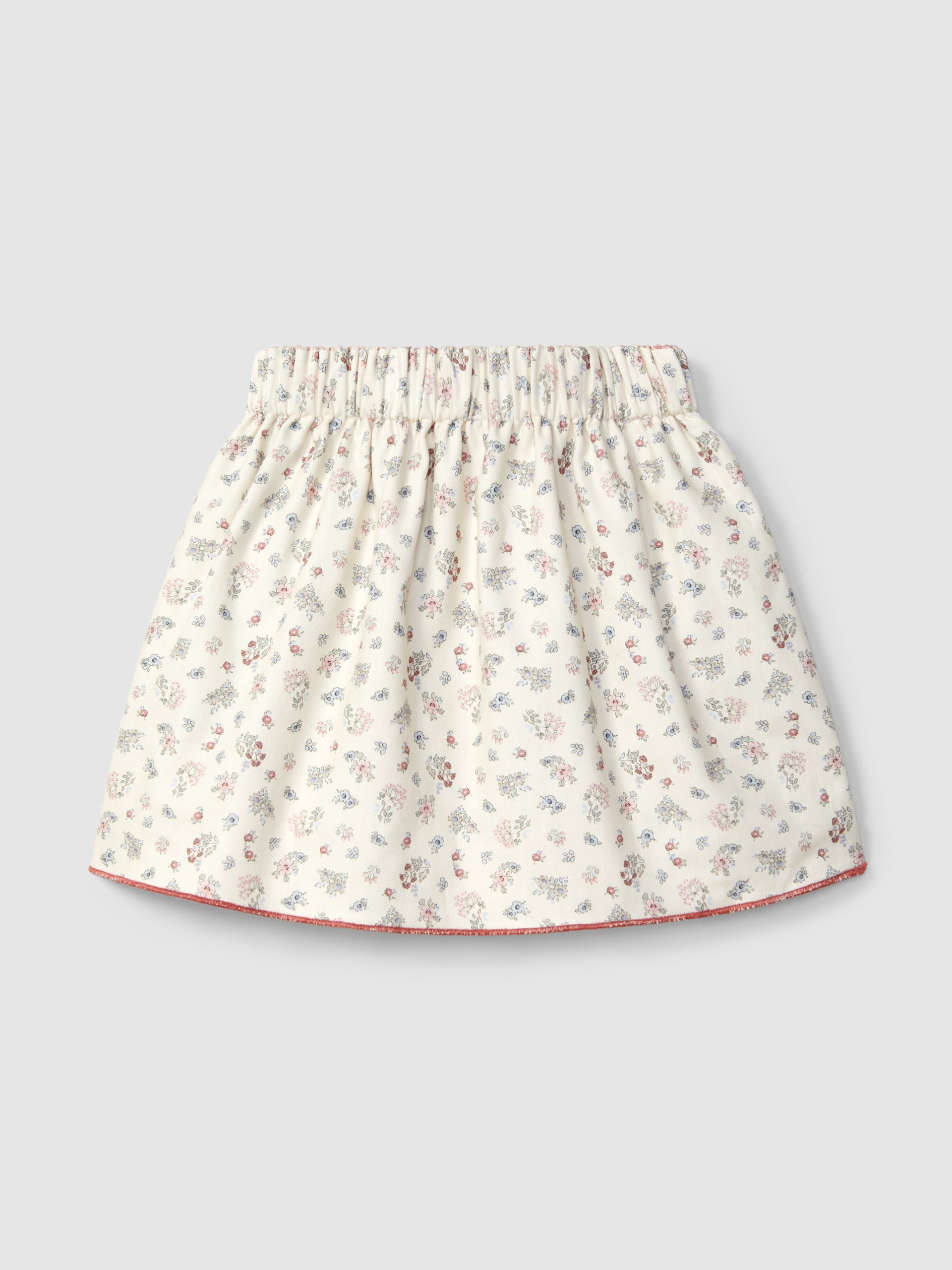 Jupe pull-up réversible. L’un des côtés est en velours côtelé léger et malléable 100 % coton imprimé à carreaux vichy. Poches fonctionnelles avec détail de volant et boutons en bois « Laranjinha » décoratifs. L’autre côté est en tissu 100 % coton avec imprimé fleuri délicat.