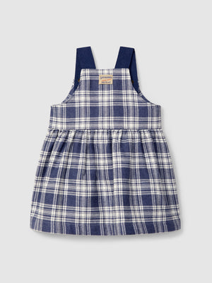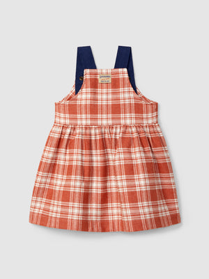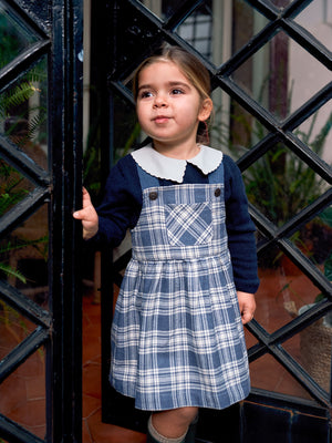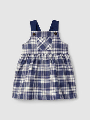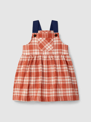 Jupe-salopette en flanelle à imprimé à carreaux et détail de poche fonctionnelle sur le devant. Ouverture avec des pressions sur les bretelles sur deux positions.
