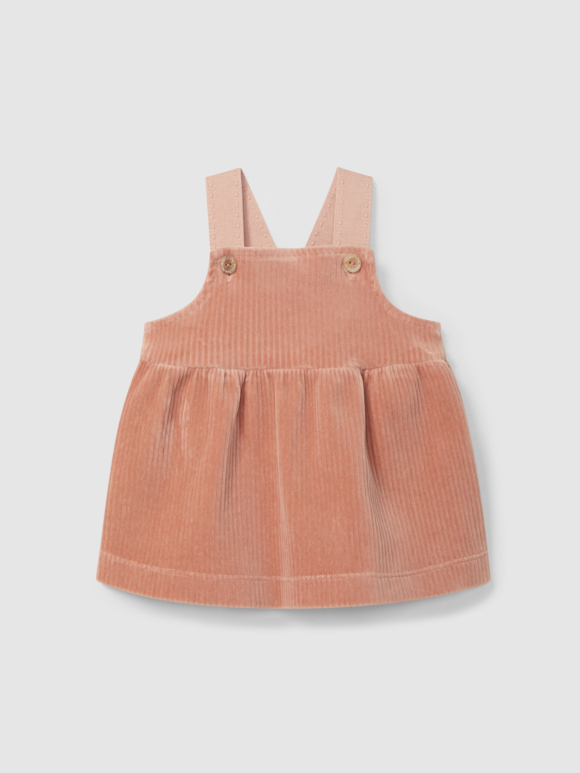 Jupe salopette en tissu de type velours côtelé large, malléable et confortable. Ouverture avec des boutons « Laranjinha » sur deux positions sur les bretelles.