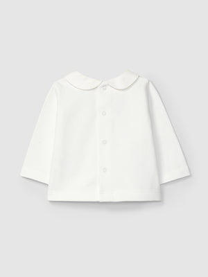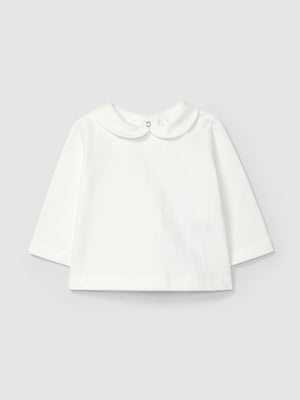 Longsleeve en maille de coton cardé avec détail de col claudine. Fermeture avec des pressions dans le dos.