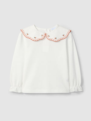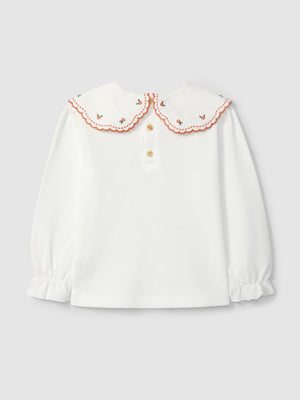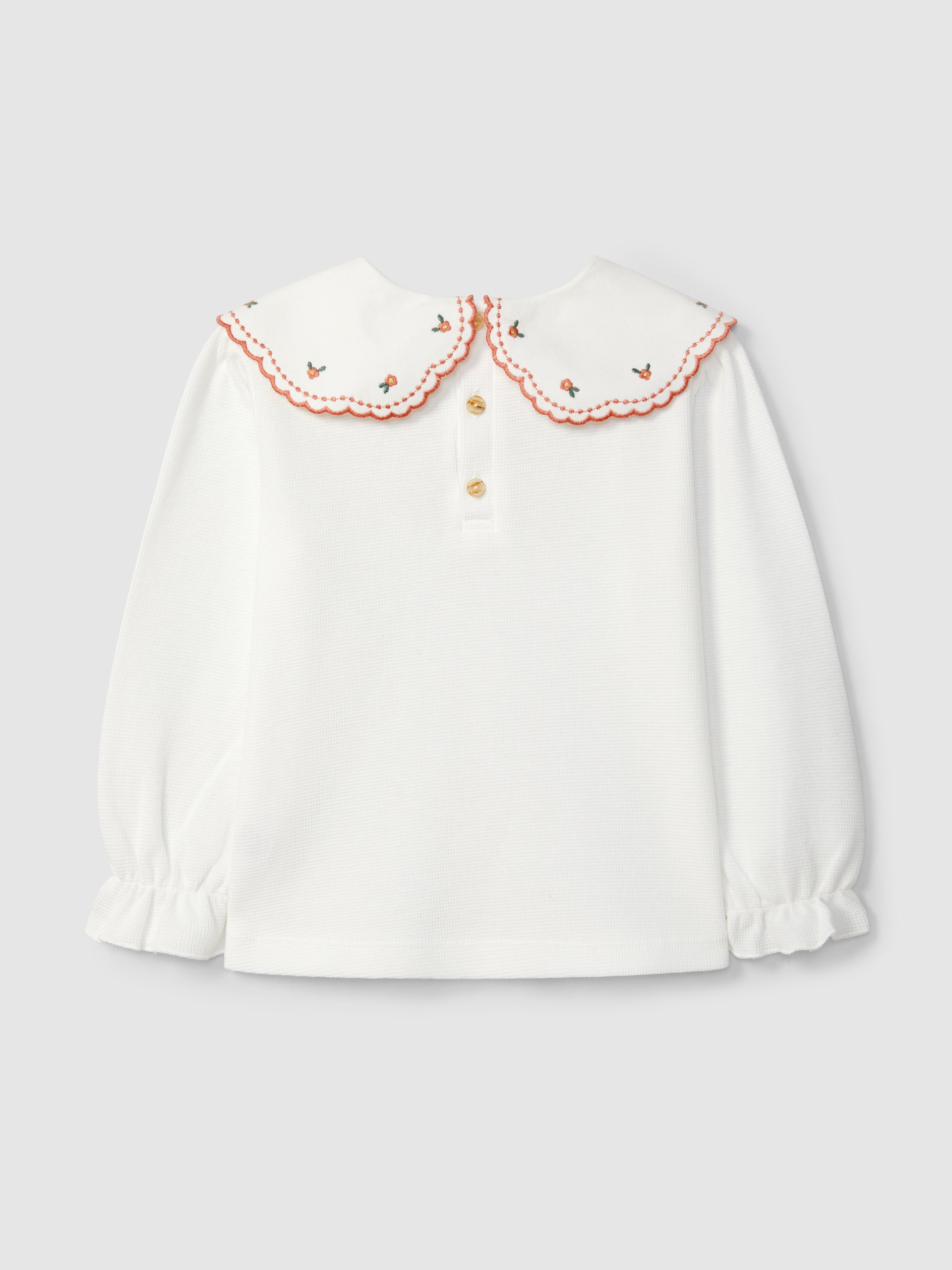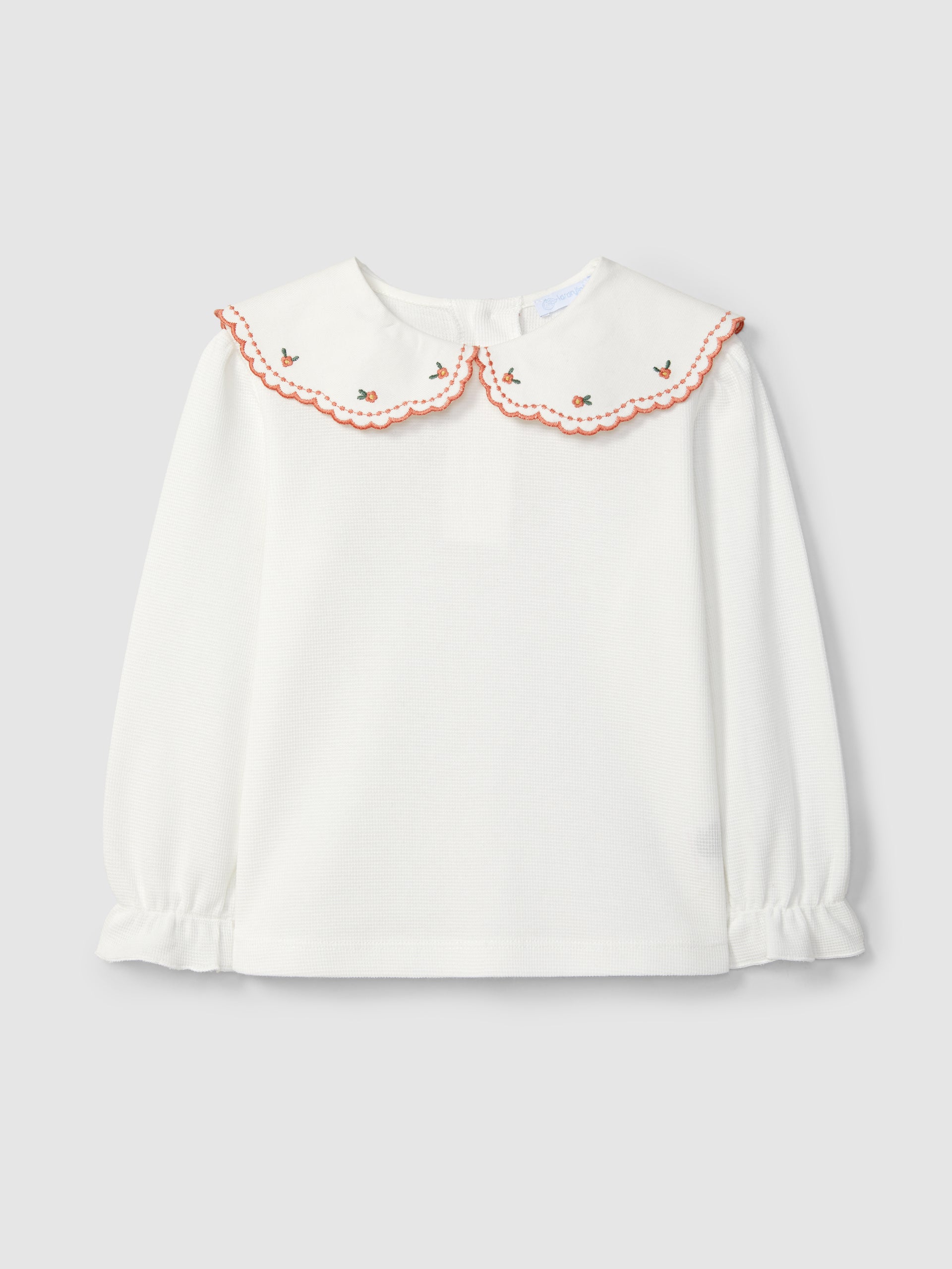 Longsleeve en maille gaufrée 100 % coton cardé. Col avec broderie de couleur en contraste. Ouverture avec des boutons « Laranjinha » dans le dos.