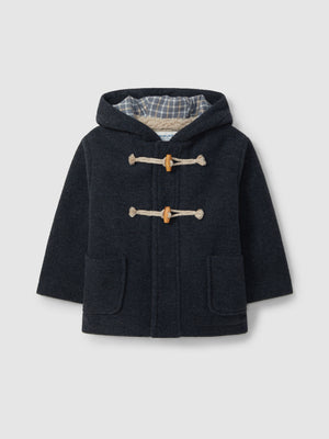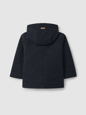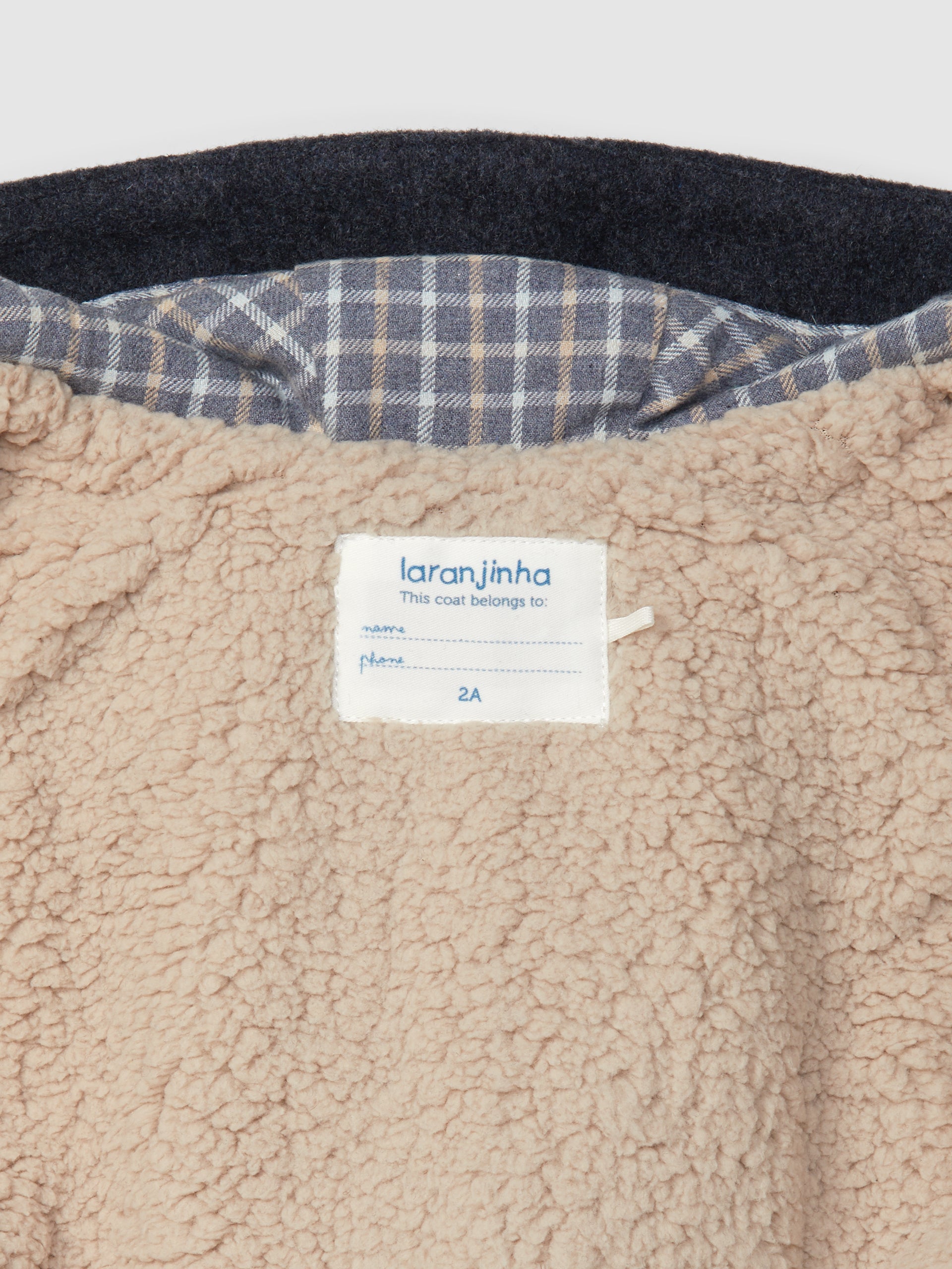 Manteau en tissu en laine. Intérieur de la capuche en tissu à carreaux et poches fonctionnelles sur le devant. Doublure en fourrure sur la poitrine et dans le dos. Fermeture avec des pressions cachées et des boutonnières.