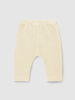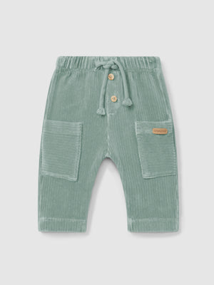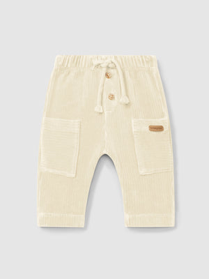 Pantalon pull-up en tissu de type velours côtelé large, malléable et confortable, avec poches fonctionnelles sur le devant. Boutons « Laranjinha » et cordon à la taille décoratifs.