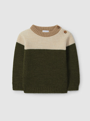 Pull tricoté avec une touche de laine col rond. Ouverture avec des boutons sur l’épaule.